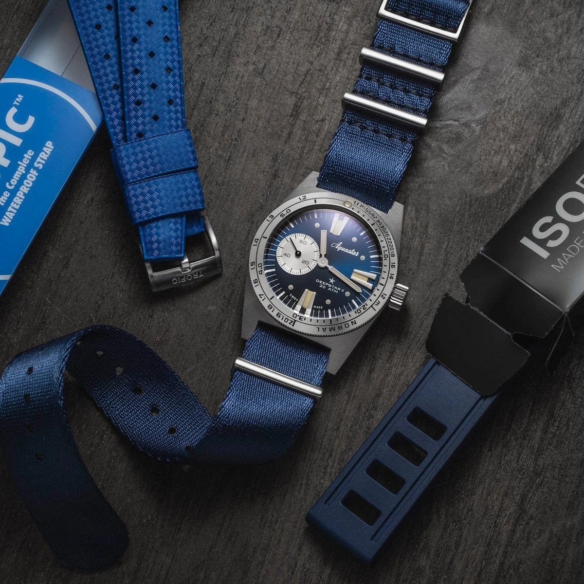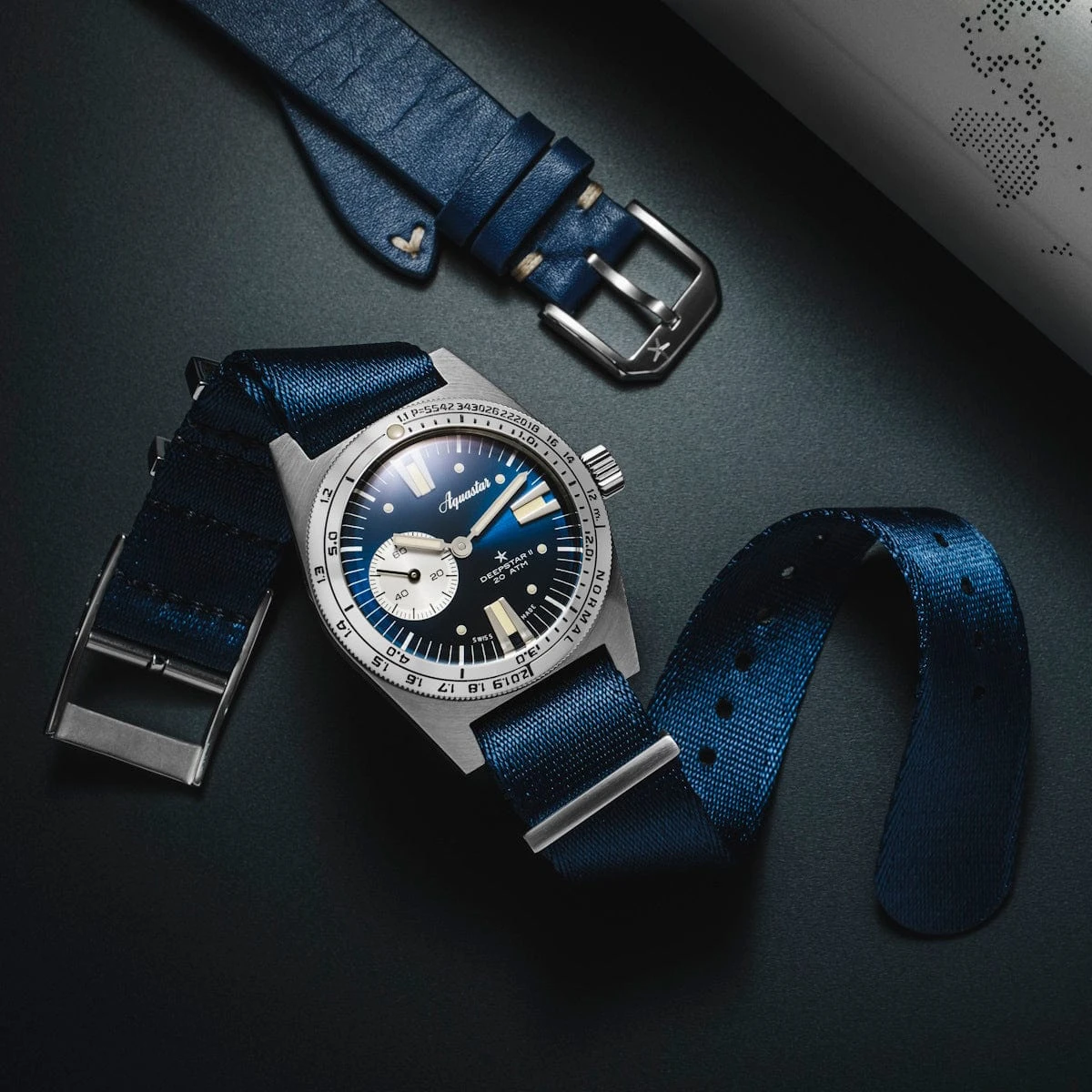 Housed in an eminently wearable 37mm stainless steel case, the new Deepstar II retains the function-first ethos and proportions of the pioneering Deepstar Chronograph from 1962, as well as two of Aquastar’s key identifiers: the rotating timing bezel bearing the brand’s own “no decompression” table used to time repeated dives (the first and only of its kind). It also features the emblematic “cyclops” style mono-compax counter originally devised by Aquastar founder and innovator Frederic Robert.