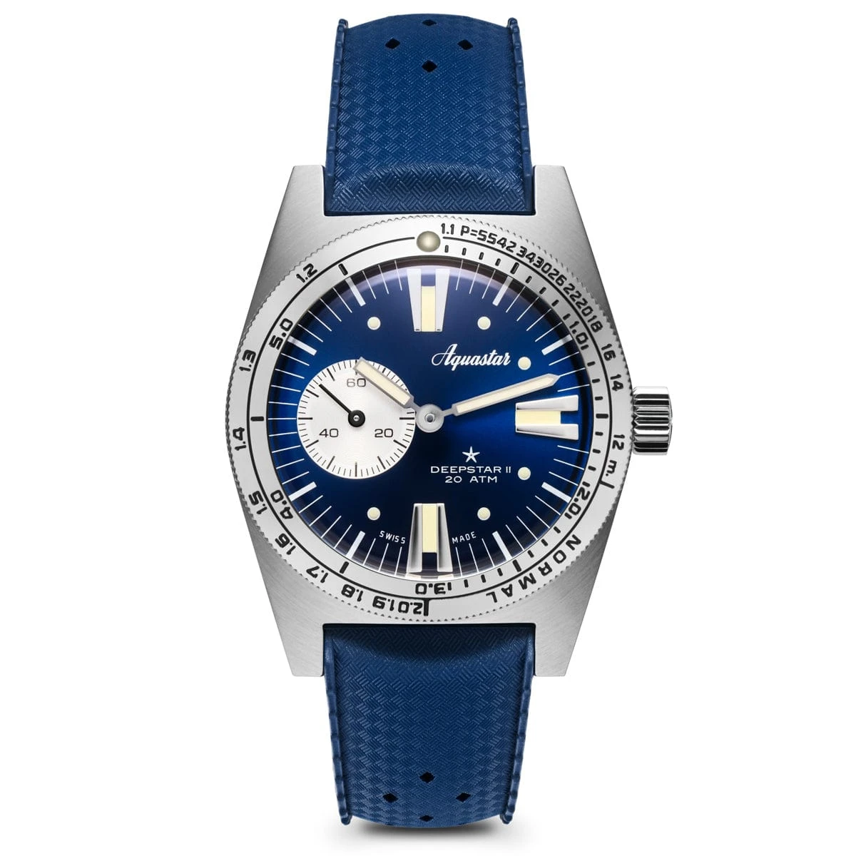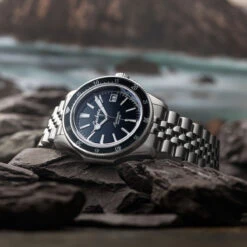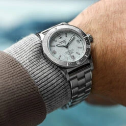 Housed in an eminently wearable 37mm stainless steel case, the new Deepstar II retains the function-first ethos and proportions of the pioneering Deepstar Chronograph from 1962, as well as two of Aquastar’s key identifiers: the rotating timing bezel bearing the brand’s own “no decompression” table used to time repeated dives (the first and only of its kind). It also features the emblematic “cyclops” style mono-compax counter originally devised by Aquastar founder and innovator Frederic Robert.