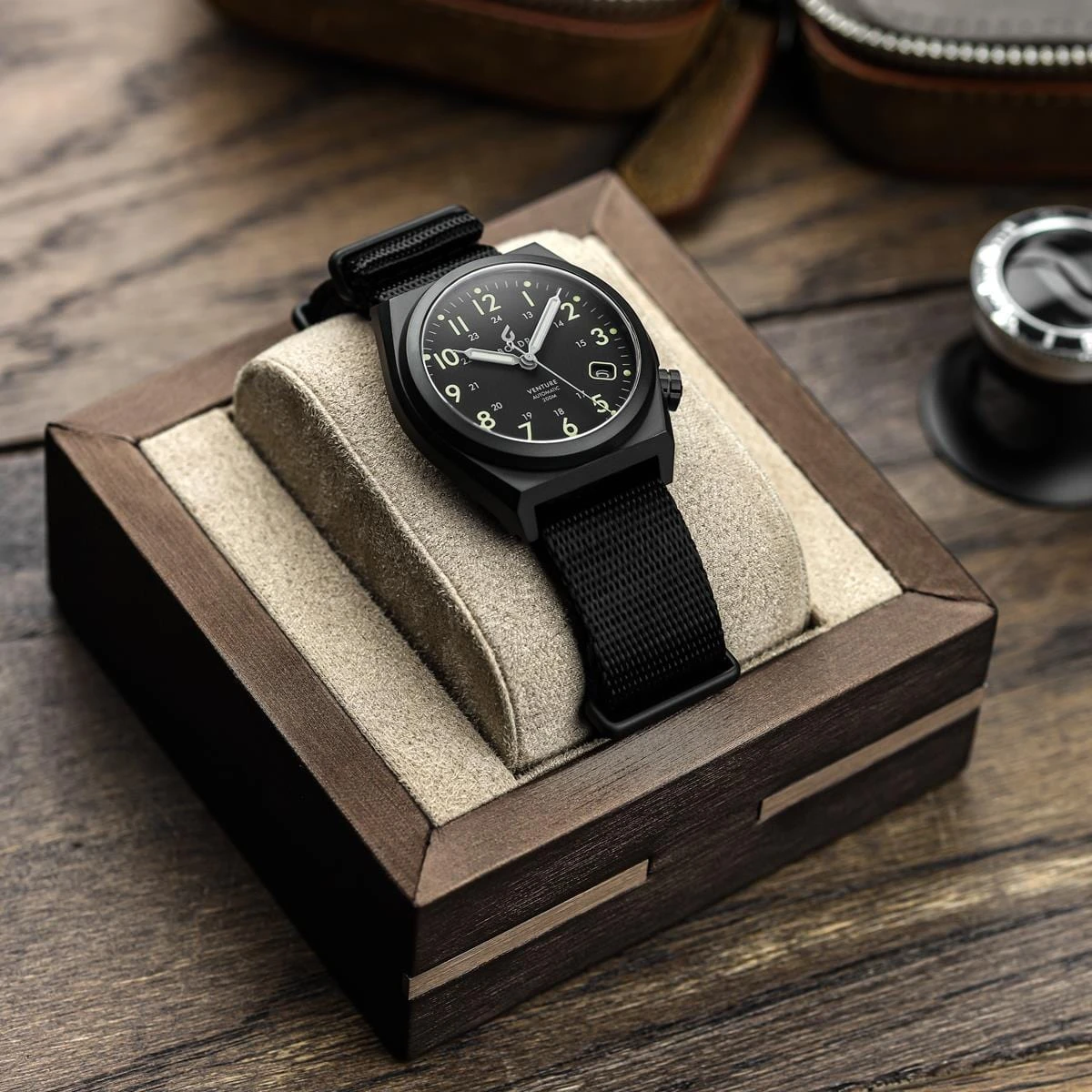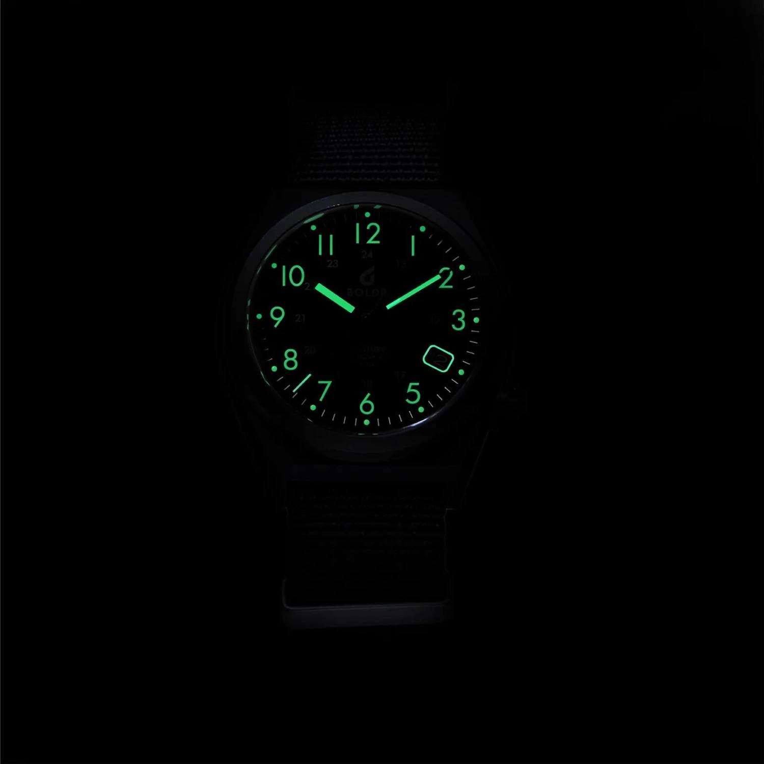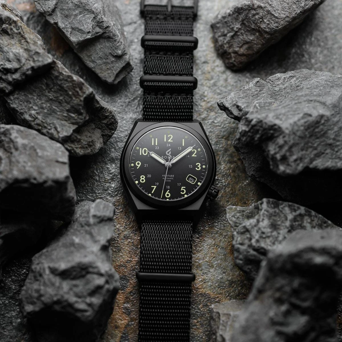 - The sleek, angular case is unique to Boldr and sets the Venture apart from other field watches.