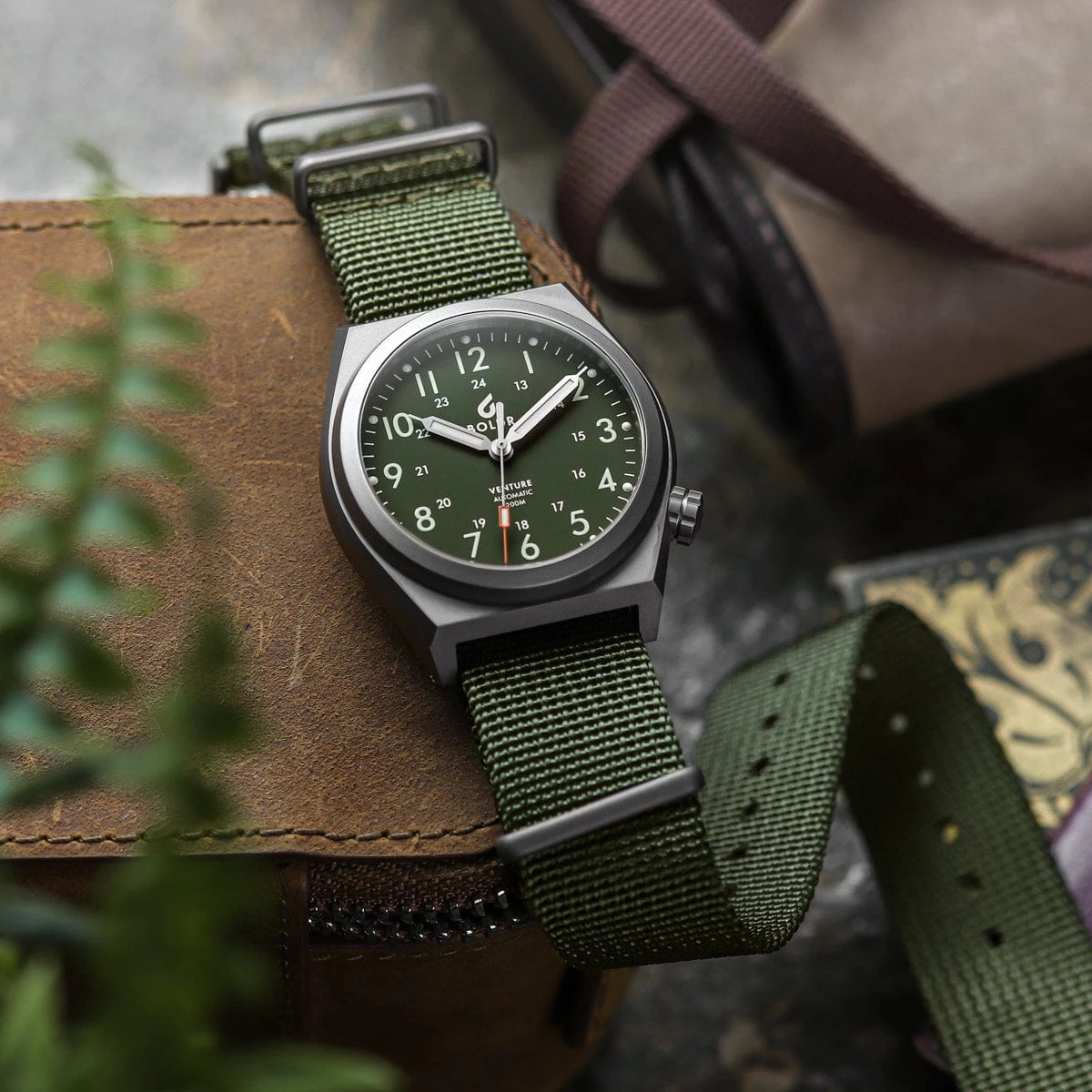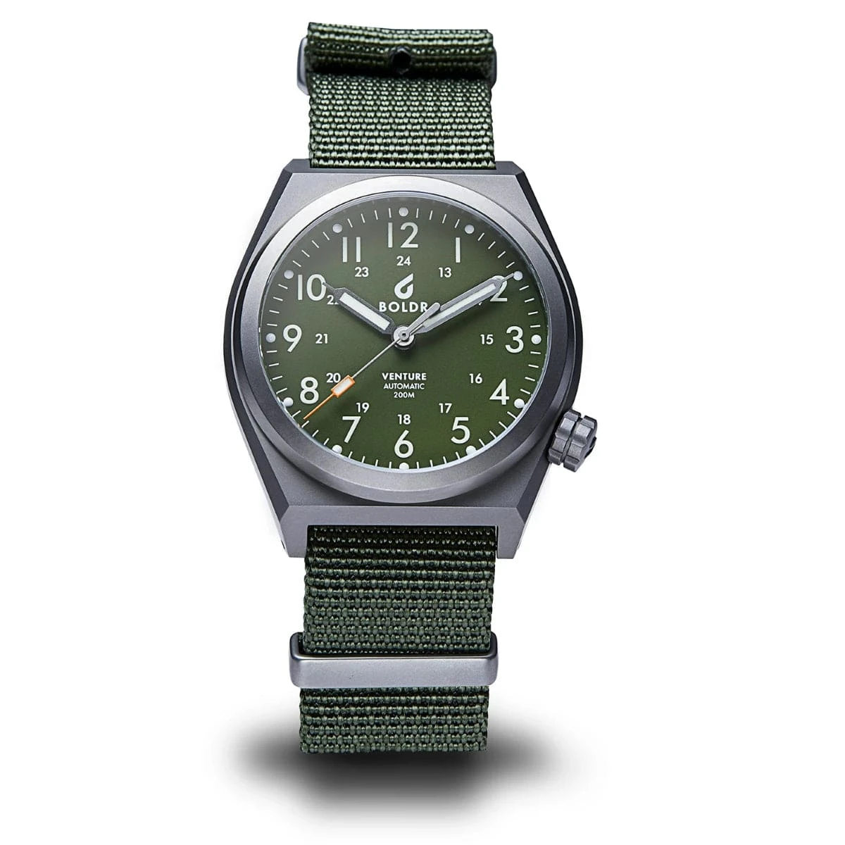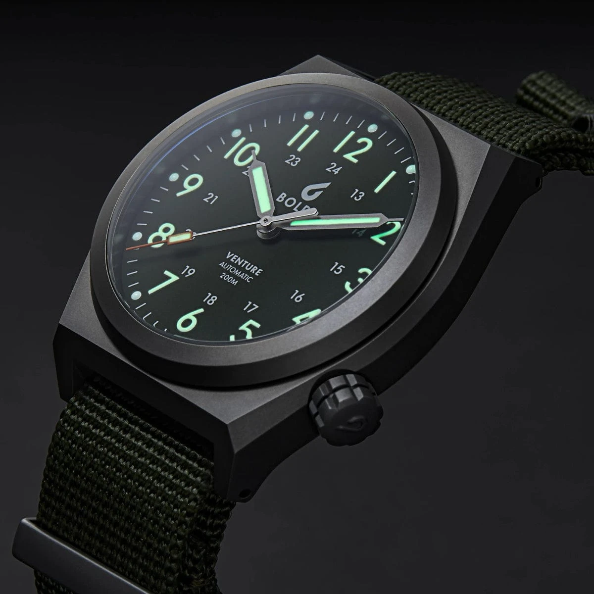 - The sleek, angular case is unique to Boldr and sets the Venture apart from other field watches.