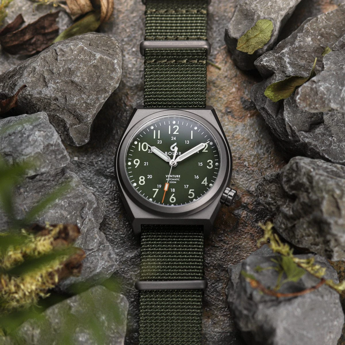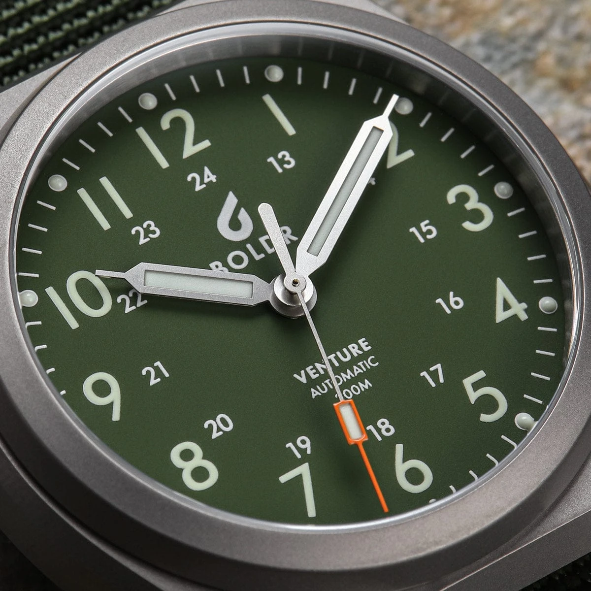 As a field watch, the Venture’s hands and markers have been painted with Japanese Superlume, to ensure that the watch remains legible in the dark.