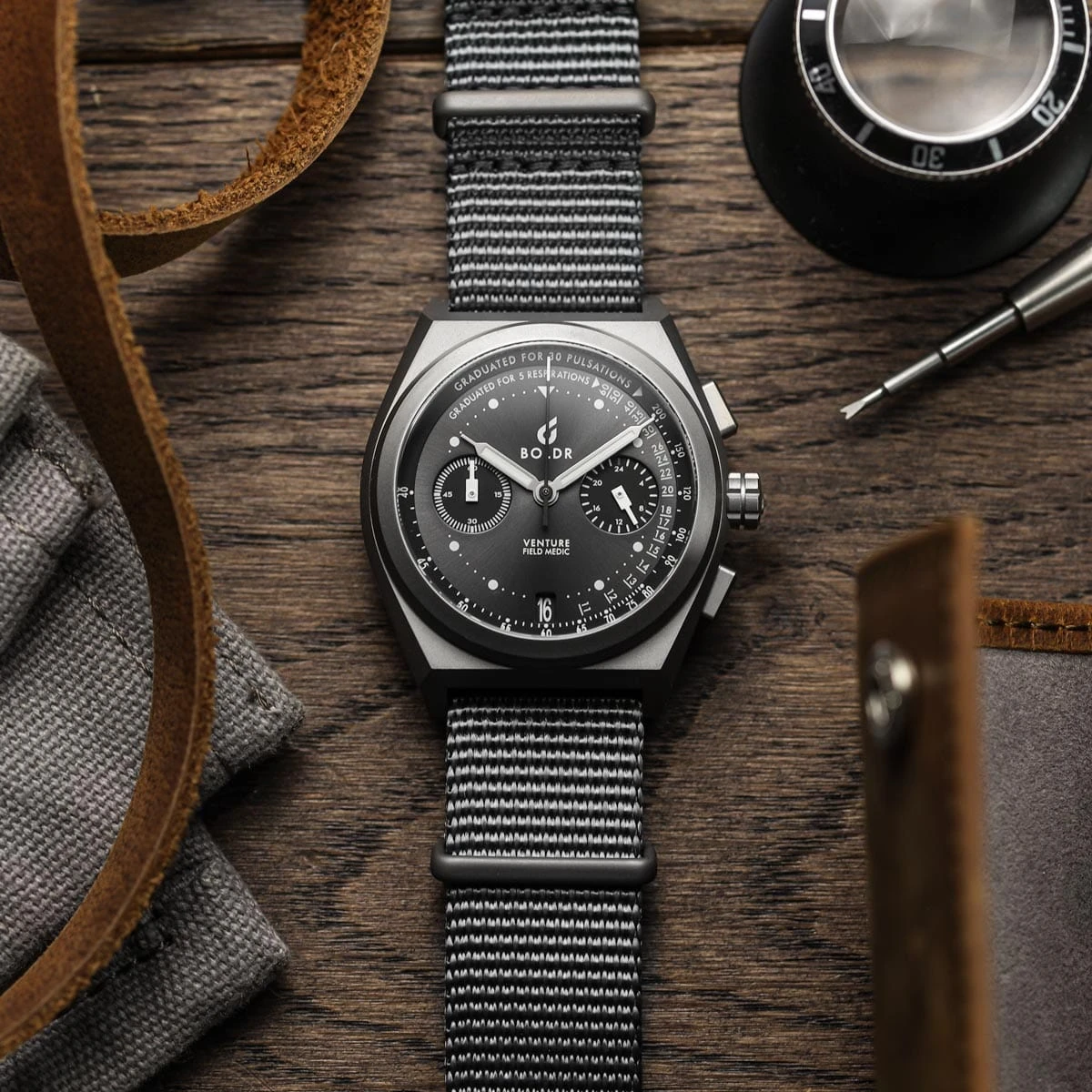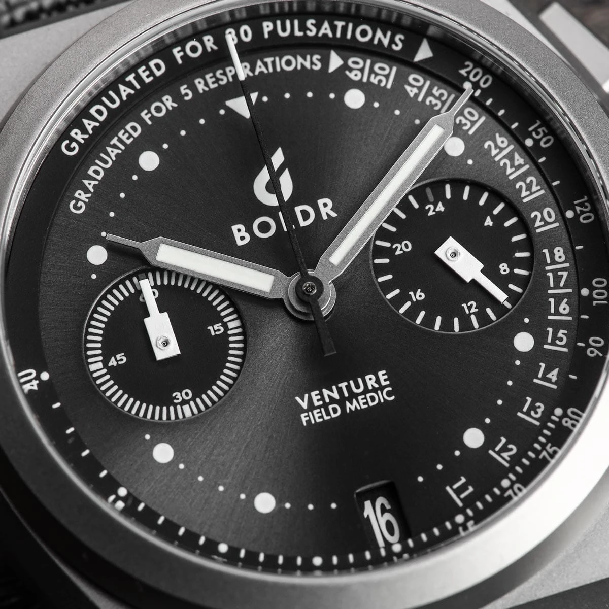 The Boldr Venture Field Medic is inspired by the bravery of healthcare workers around the world during the COVID-19 pandemic. As such, the watch was designed for medical professionals to use to measure pulse rates and respiratory counts.