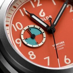 The Venture Wayfarer offers a twist on the classic field watch layout with the addition of a 24-hour subdial at 9 o’clock. At 38mm wide and 12mm thick, the watch sits very comfortably on the wrist, and as it’s titanium it’s exceptionally light.
