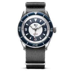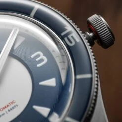 Every aspect of this watch has been carefully considered. The 120-click bezel uses a polished sapphire insert that’s impressively scratch-resistant, complementing the refined blue and white design of the dial. The dial is inspired by the history of regatta races such as The America’s Cup, giving the watch a distinctly nautical feel while remaining reminiscent of the box crystals seen on the classic dive watches of the 50s and 60s.