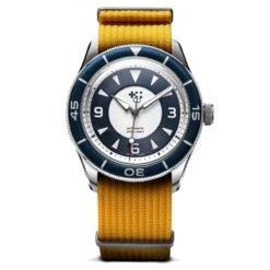 Every aspect of this watch has been carefully considered. The 120-click bezel uses a polished sapphire insert that’s impressively scratch-resistant, complementing the refined blue and white design of the dial. The dial is inspired by the history of regatta races such as The America’s Cup, giving the watch a distinctly nautical feel while remaining reminiscent of the box crystals seen on the classic dive watches of the 50s and 60s.