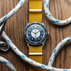 Thanks to the quick-change mechanism, straps can be swapped out with ease and without tools ideal as this watch comes with two complementing watch straps. One is the WatchGecko Overton genuine Italian V-stitch leather watch strap in coral, made from vegetable-tanned calf leather. The second strap is a yellow British Military watch strap, which has a ribbed texture to the 1.2mm thick nylon making it incredibly hard-wearing. Both straps also feature a collaboration-exclusive Christopher Ward + WatchGecko laser-engraved buckle.