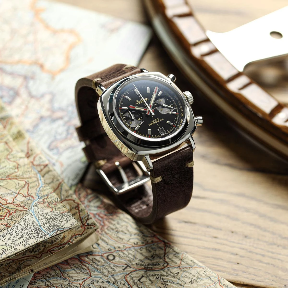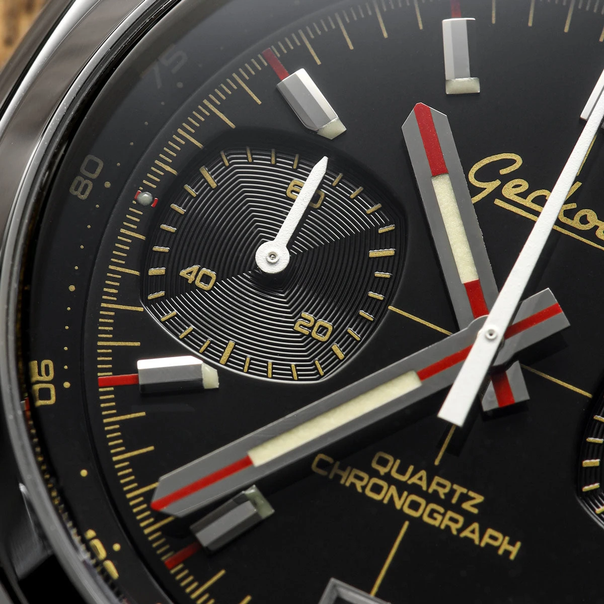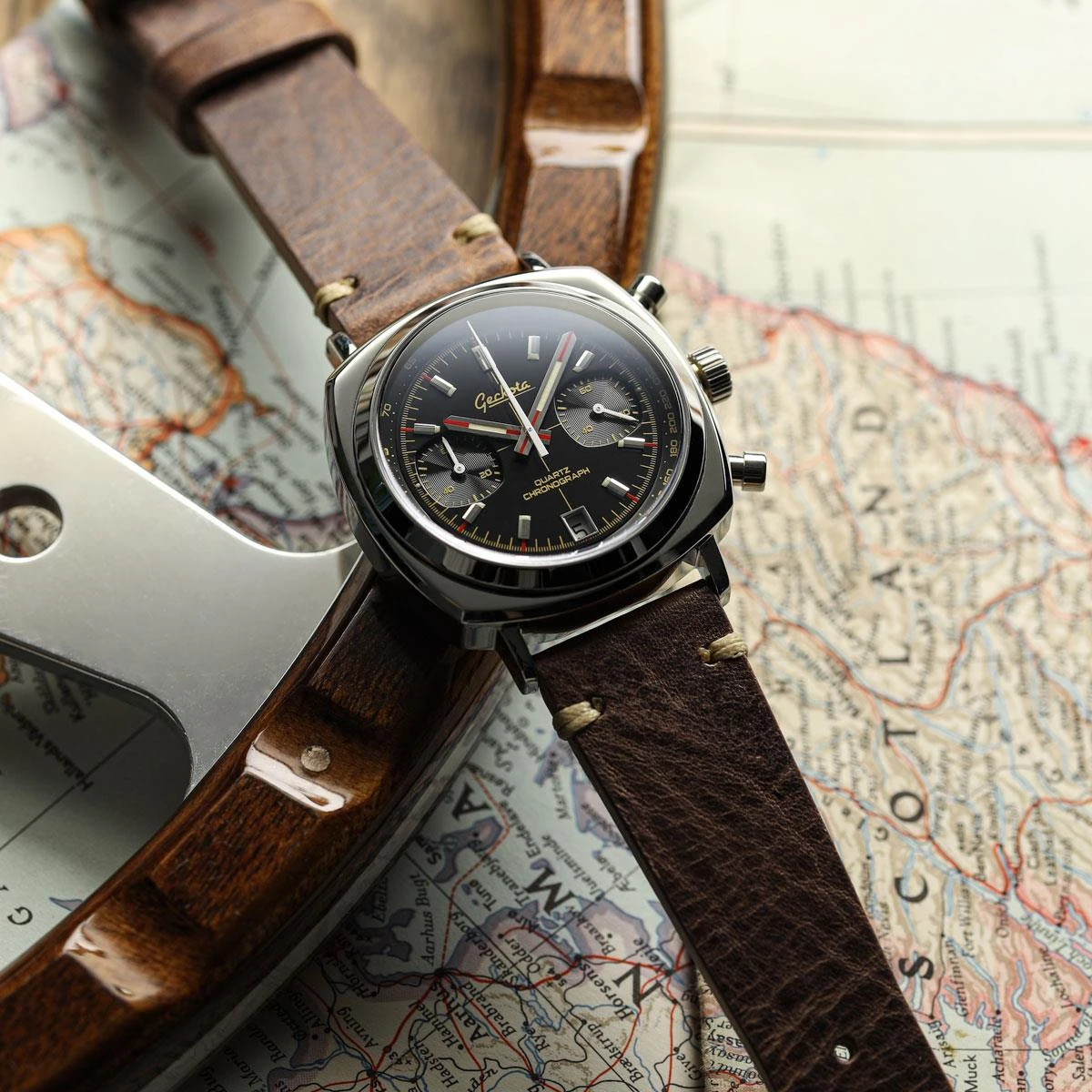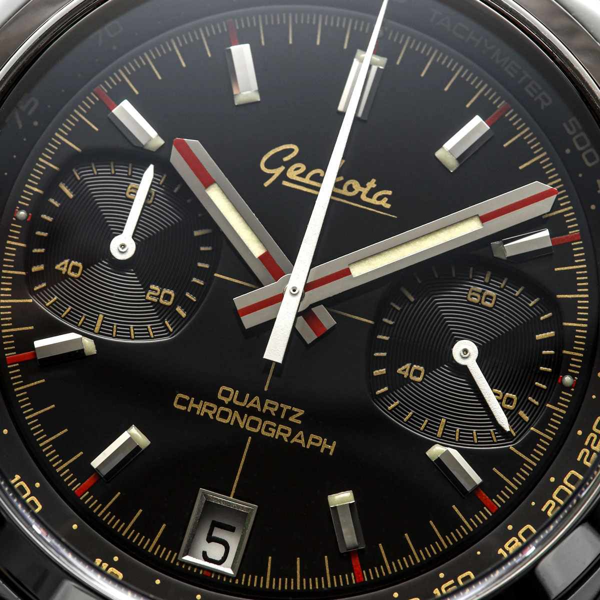 Benefiting from a double dome sapphire crystal and a fully polished 316L stainless steel 42mm ‘cushion’ case, the Chronotimer is a standout watch with vintage racing-watch design cues and modern specs. A screw-down crown also enables a water-resistance rating of 100 meters (10ATM) and every Geckota Chronotimer is supplied with a 2-year warranty.