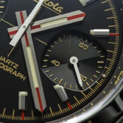 The gloss dial adds a unique touch to the watch and gives it a distinct and sophisticated appearance. The chronograph function and retro styling make it an ideal choice for those who appreciate both classic and modern design elements in a watch. The small sub-dial on the right-hand side of the watch dial displays running seconds, while the dial at 9 counts chronograph minutes when the stopwatch function is running. This is a standard layout for chronograph watches and makes it easy to read the elapsed time while the chronograph is running.