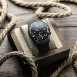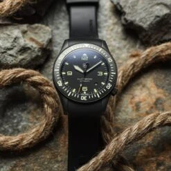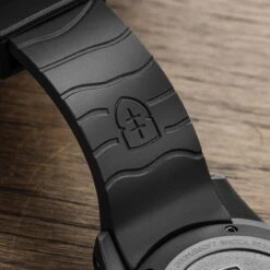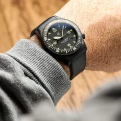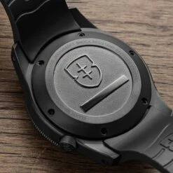 The 43mm case sports a utilitarian style with a matte vapour blasted finish and a 120-click unidirection bezel with tactile hobnail knurling. Functional enhancements include the triple sealed screw down crown at 4H, tough 2mm anti-reflective sapphire crystal and solid screw in strap bars for easy strap-changes. The watch comes fitted on a durable, soft EPDM fitted rubber strap.Â