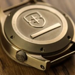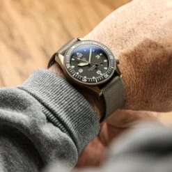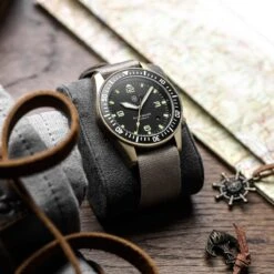 The 43mm case sports a utilitarian style with a matte vapour blasted finish and a 120-click unidirection bezel with tactile hobnail knurling. Functional enhancements include the triple sealed screw down crown at 4H, tough 2mm anti-reflective sapphire crystal and solid screw in strap bars for easy strap-changes. The watch comes fitted on a desert Brown webbed British Military watch strap.