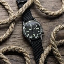 The style is unmistakably utilitarian with a matte vapour blasted finish and a 120-click unidirection bezel with tactile hobnail knurling hardened to 1200HV Vickers. Functional enhancements include the triple sealed screw down crown at 4H, tough 2mm anti-reflective sapphire crystal and solid screw in strap bars for easy strap-changes. The watch comes fitted on an extra long fitted black Military strap, woven from closely knitted polypropylene with laser-cut holes and gunmetal grey hardware.