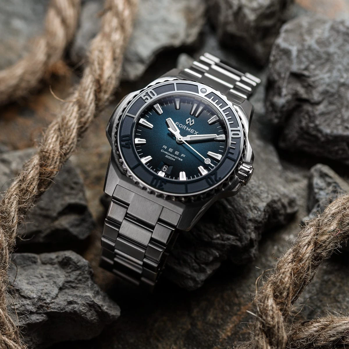 The sunburst finished dial is manufactured in-house and available in multiple colours. The gradient for the different colours is sprayed by hand. The REEF’s bold hour markers are hand-applied and the hands and hour markers, along with a capsule on the bezel’s zero marker, are filled with Super-LumiNova BGW9 which emits a blue glow.