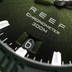 The sunburst finished dial is manufactured in-house and available in multiple colours. The gradient for the different colours is sprayed by hand. The REEF’s bold hour markers are hand-applied and the hands and hour markers, along with a capsule on the bezel’s zero marker, are filled with Super-LumiNova BGW9 which emits a blue glow.