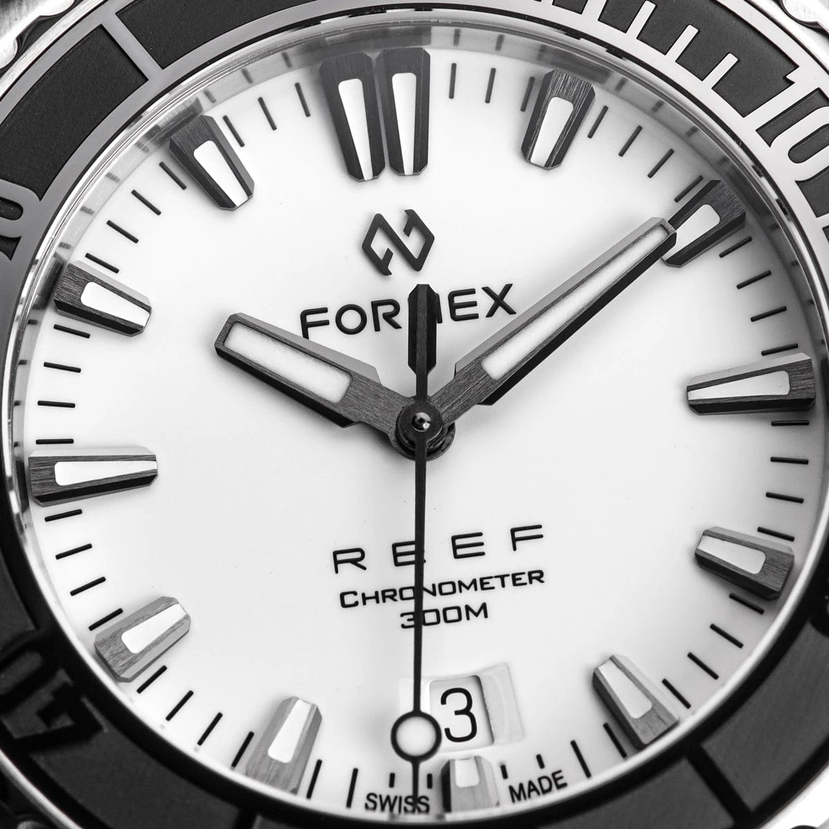 The striking 42mm Formex REEF diver has a highly distinctive stainless-steel case which provides both deep dive security and aesthetic symmetry. A double gasket protects the crown, and the watch is fully tested to 300m of water resistance. Mirror polished bevels and brushed surfaces throughout the design create a pleasing balance between elegance and the brand’s high-octane spirit.