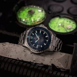 The sunburst finished dial is manufactured in-house and available in multiple colours. The gradient for the different colours is sprayed by hand. The REEF’s bold hour markers are hand-applied and the hands and hour markers, along with a capsule on the bezel’s zero marker, are filled with Super-LumiNova BGW9 which emits a blue glow.