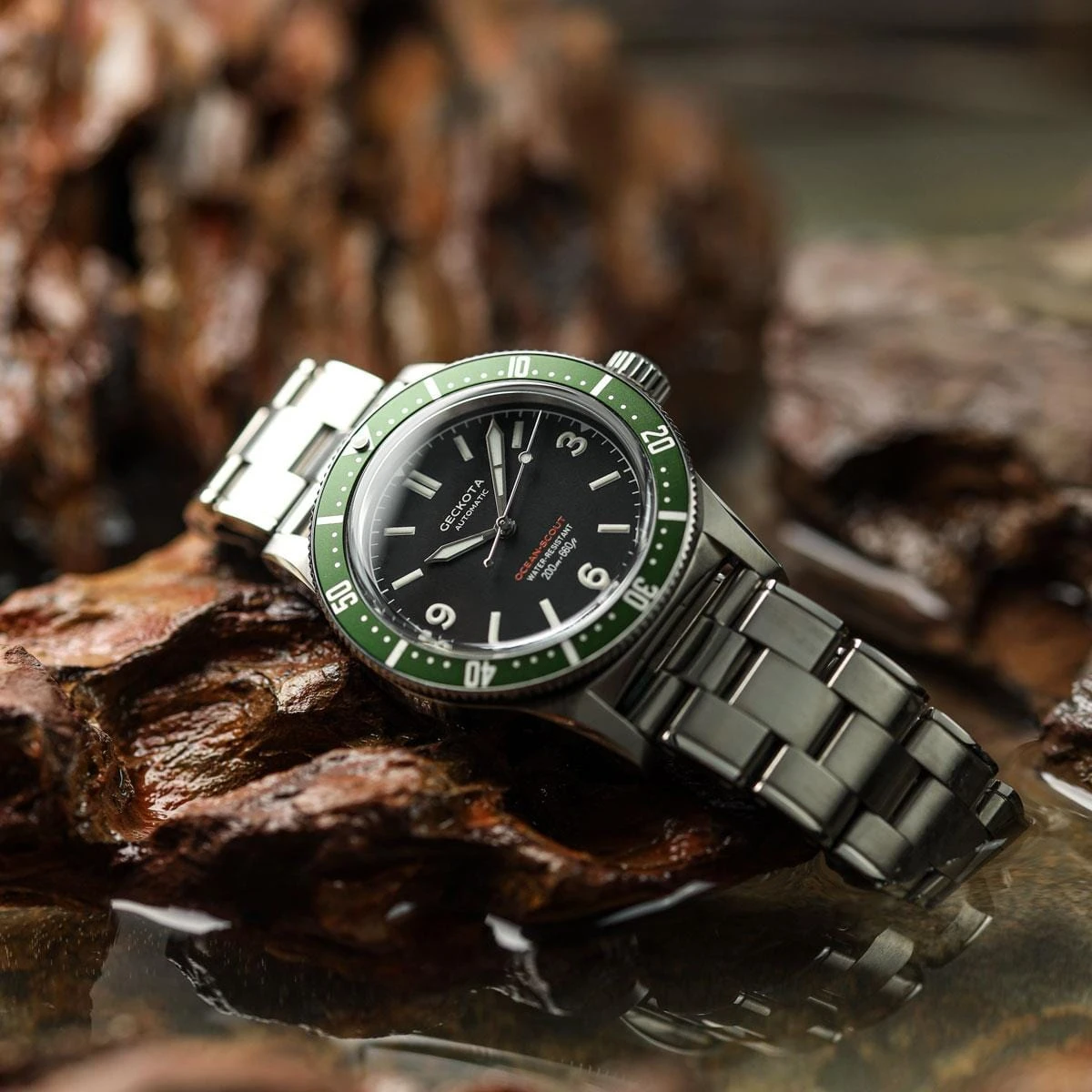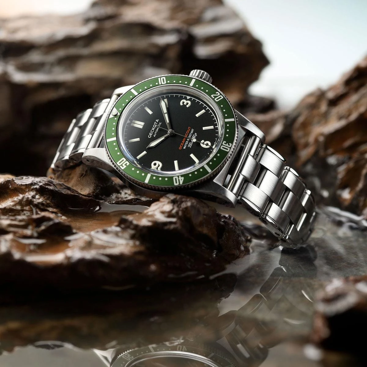 Embark on a thrilling adventure of exploration and discovery with the Geckota Ocean-Scout. This Dive watch encapsulates the timeless essence of ocean voyages and the quest for new horizons. With its exceptional craftsmanship and reliability, this timepiece accompanies you on every step of your journey, ensuring that you are always prepared for the next exciting discovery.