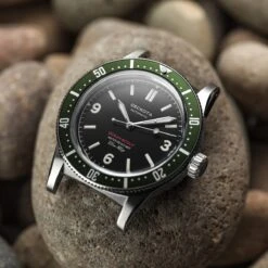 The Ocean-Scout has a classic 3, 6, 9 dial design available in blue, green or black. Each hour marker, whether a numeral or baton, is crafted with raised and shaped luminescence. Sword hands compliment the vintage theme established by the crown and crystal. A minute track circumnavigates the dial and the seconds hand has been planned to the perfect length; just making contact with the track.