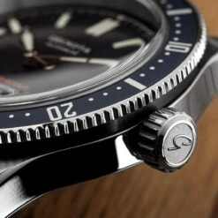 The Ocean-Scout has a classic 3, 6, 9 dial design available in blue, green or black. Each hour marker, whether a numeral or baton, is crafted with raised and shaped luminescence. Sword hands compliment the vintage theme established by the crown and crystal. A minute track circumnavigates the dial and the seconds hand has been planned to the perfect length; just making contact with the track.