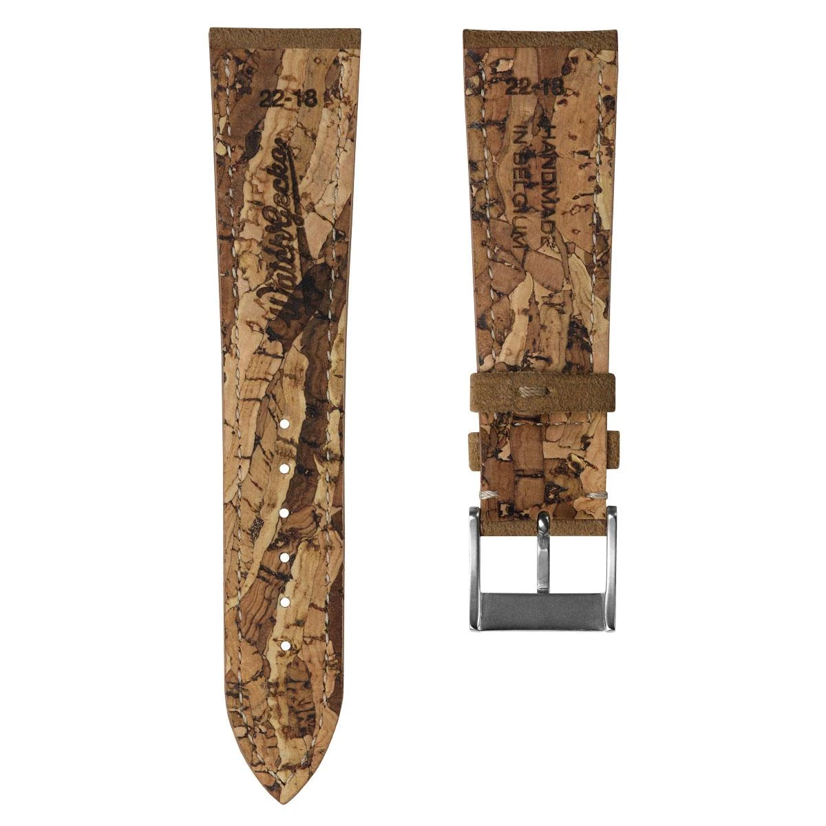 Produced from Alcantara Suede, a synthetic textile material, this strap offers a unique texture and luxurious feel on the wrist. Handmade in Belgium this vegan strap is paired beautifully with a cork lining which offers a superb alternative to leather linings. The hand-stitched material edges are expertly crafted using contrasting beige thread and hand-painted with colour stain to enhance the leather’s appearance.