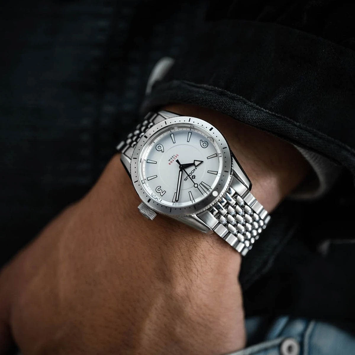The case measures 39mm in diameter and 47mm lug-to-lug. The stepped case design is made from highly durable stainless-steel and features an engraved solid screw-down caseback for 100 metres of water resistance. The case also features a 120-click unidirectional bezel that doesn’t feel bulky, giving the watch a total height of only 13mm.