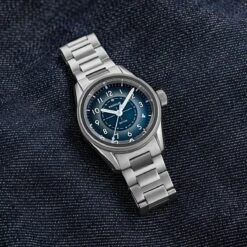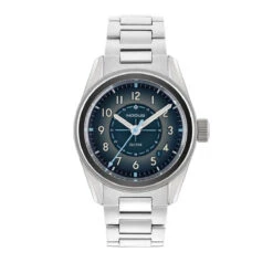 The case measures 38mm in diameter and 47mm lug-to-lug. The stepped case design is made from highly durable stainless-steel and features an engraved solid screw-down caseback for up to 150 metres of water resistance. The Sector Field watch uses a mixture of sandblasted and high-polished surfaces.