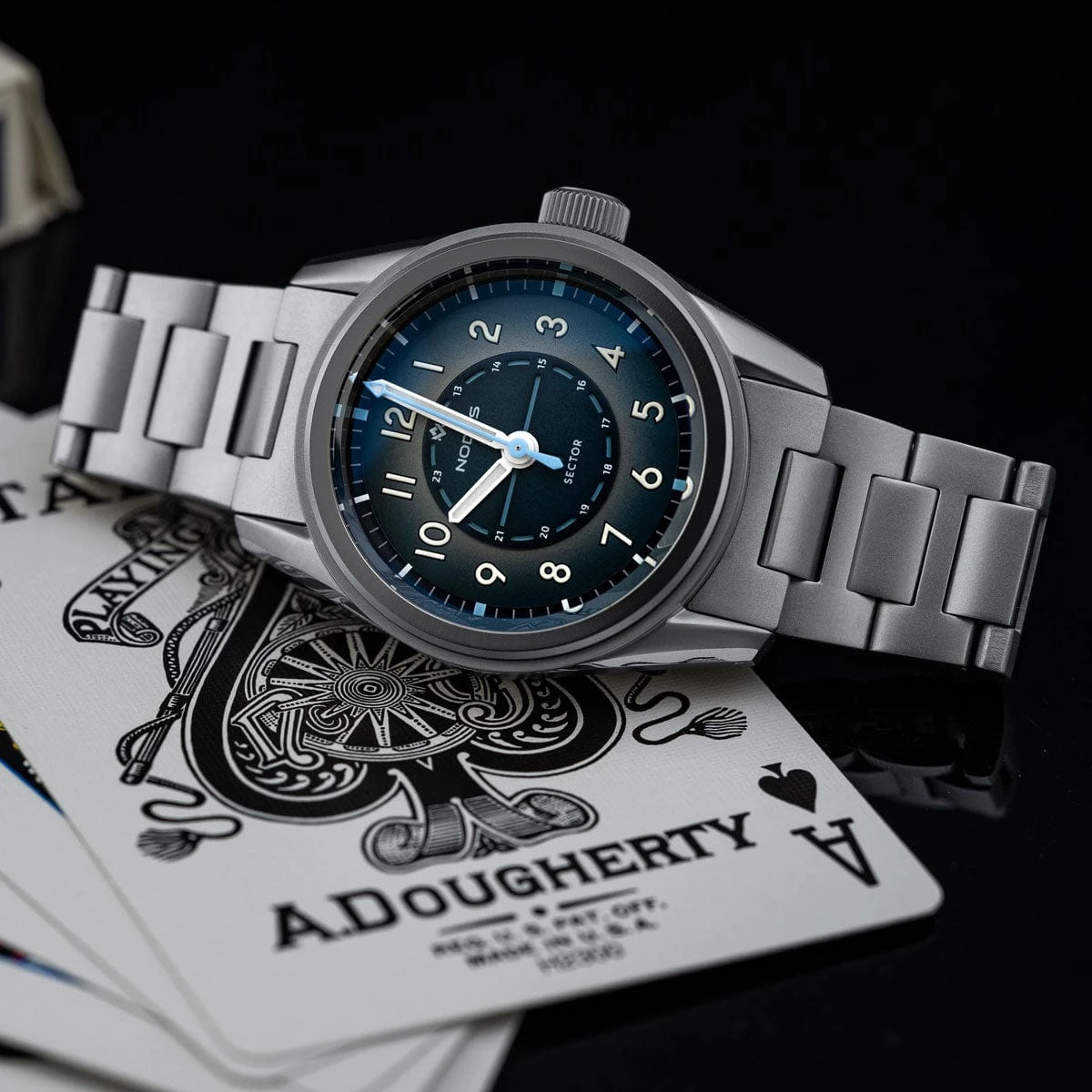 The Sector Field has all the key elements of a mil-spec field watch. Large numerical indices for easy legibility, water-resistant construction and a 24-hour military time track.