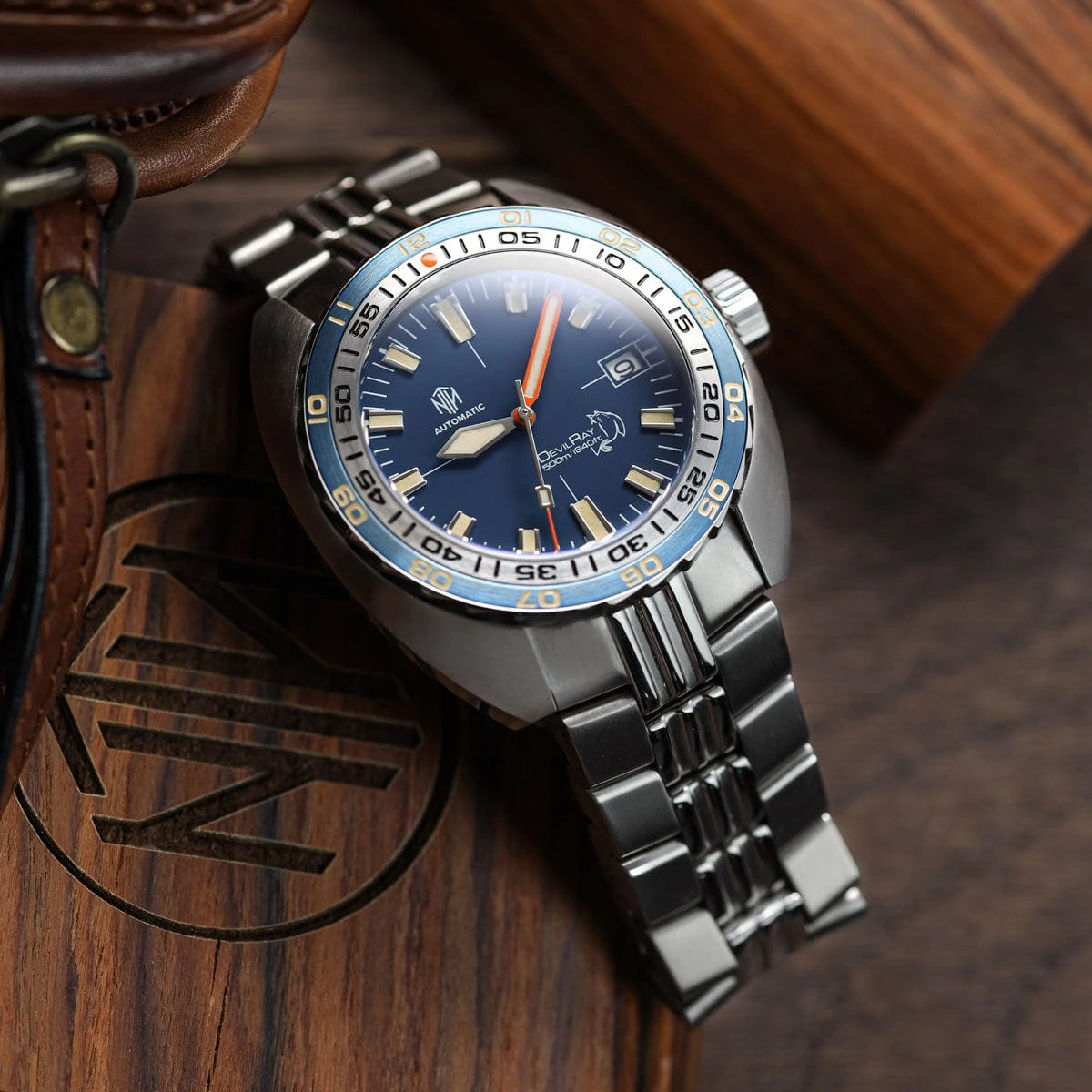 The DevilRay’s steel cushion case shrouds a 120-click, unidirectional bezel. This bezel features a saw-tooth edge for easy manipulation, as well as a durable steel insert. To make it easy to distinguish between the outer and inner scales on the bezel, we opted for a blue coloured DLC coating on the insert.