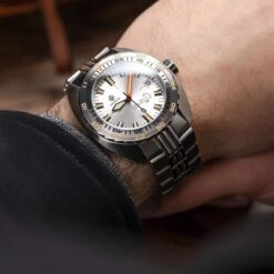 To help make the watch look even more retro, we went with a classic sword handset that was a firm favourite of vintage dive watches. The bold orange minute hand pops out against the silver dial, so it’s easy to read at a glance.