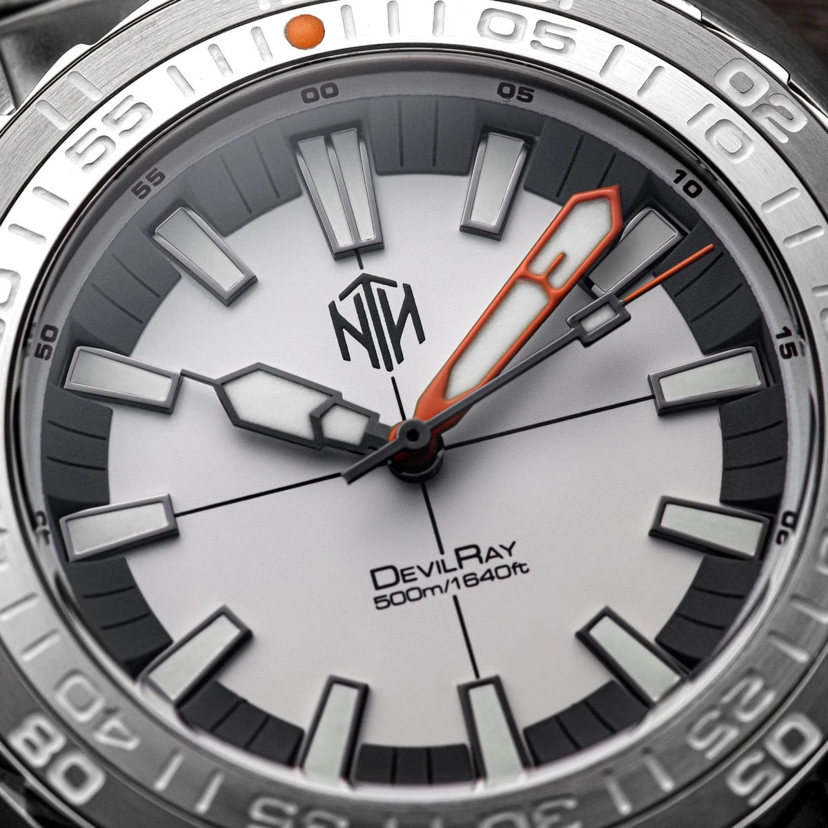 WatchGecko are thrilled to announce our first collaboration with a watch brand! This white dial DevilRay is one of two watches we designed in partnership with NTH, and which is available exclusively from us.