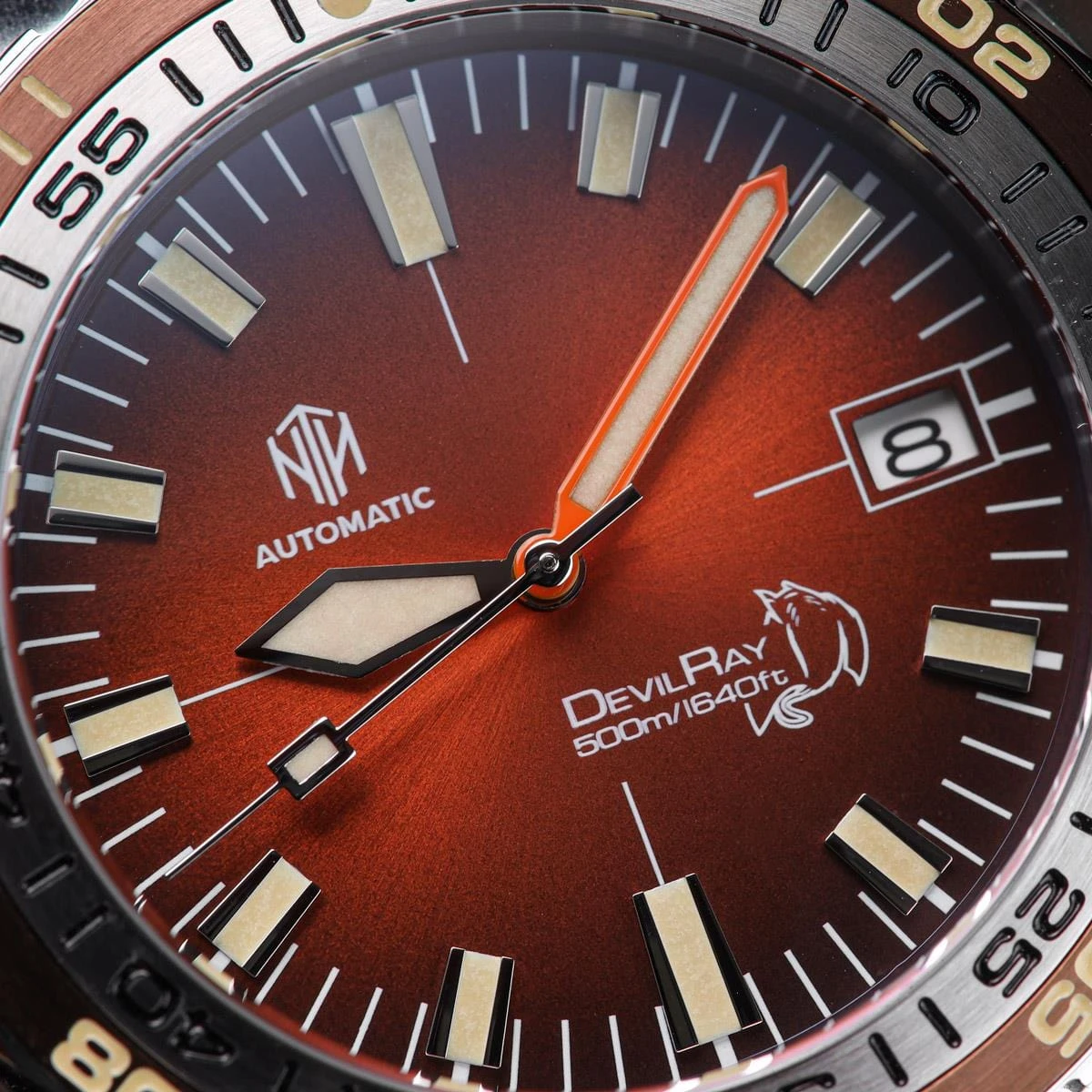 The DevilRay’s steel cushion case shrouds a 120-click, unidirectional bezel. This bezel features a saw-tooth edge for easy manipulation, as well as a durable steel insert. To make it easy to distinguish between the outer and inner scales on the bezel, we opted for a brown coloured DLC coating on the insert.