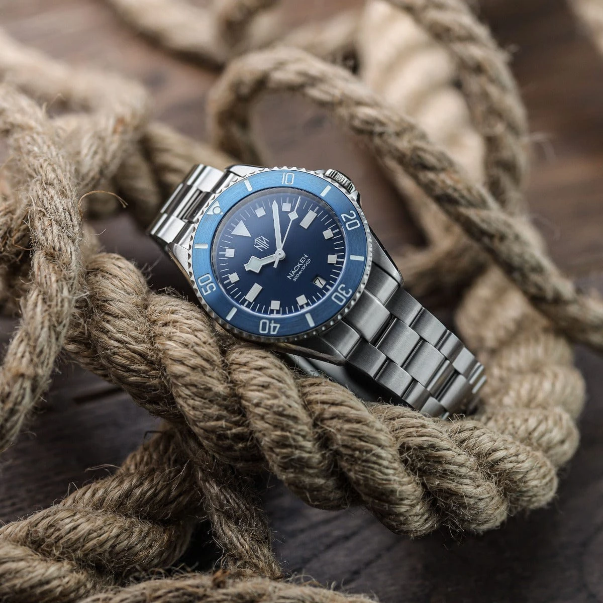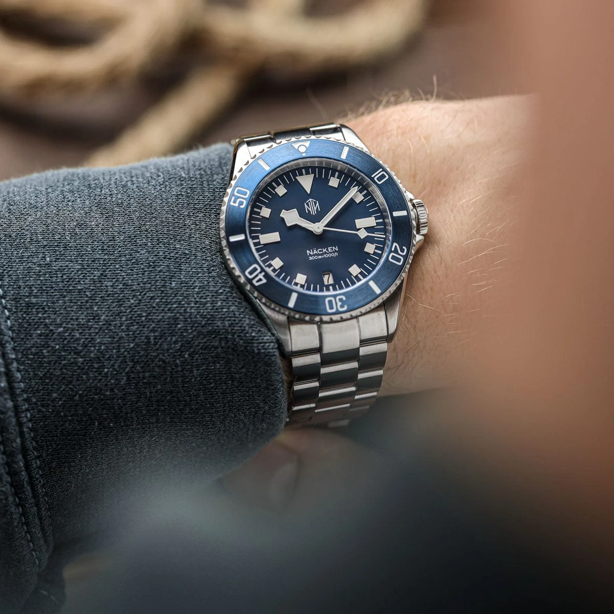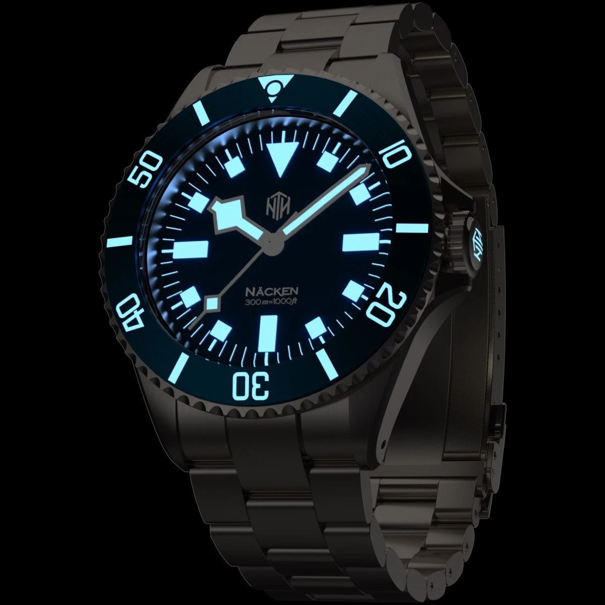 With its snowflake hour hand and square markers, the NTH Näcken takes its inspiration from the iconic Tudor “snowflake” submariners. The matte blue dial is very reminiscent of these classic vintage dive watches, as well as the current Tudor Pelagos.