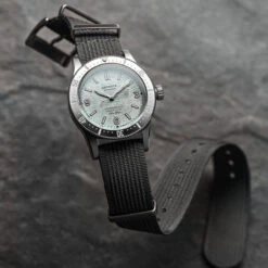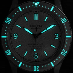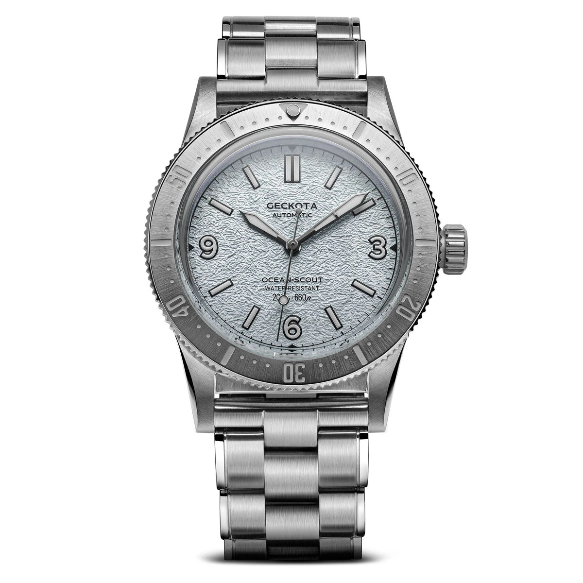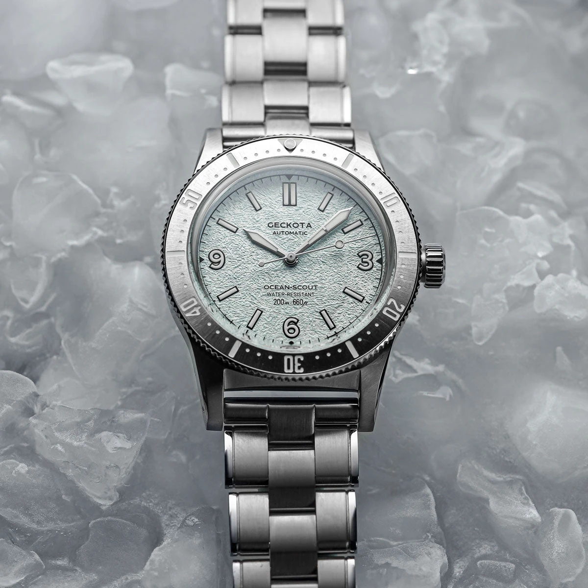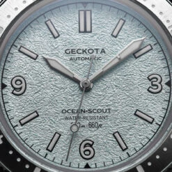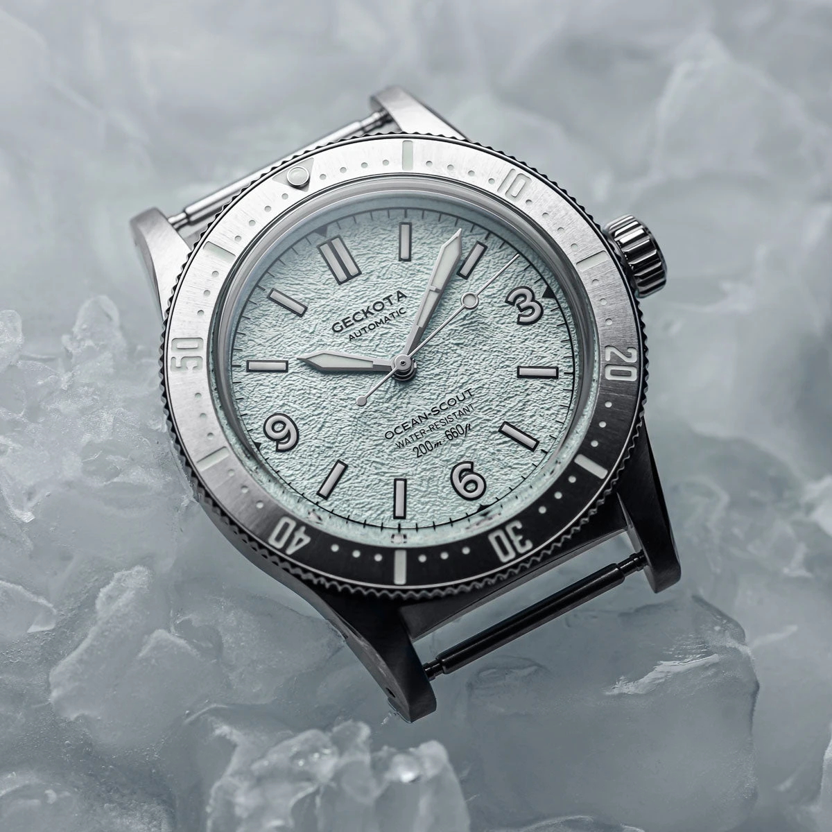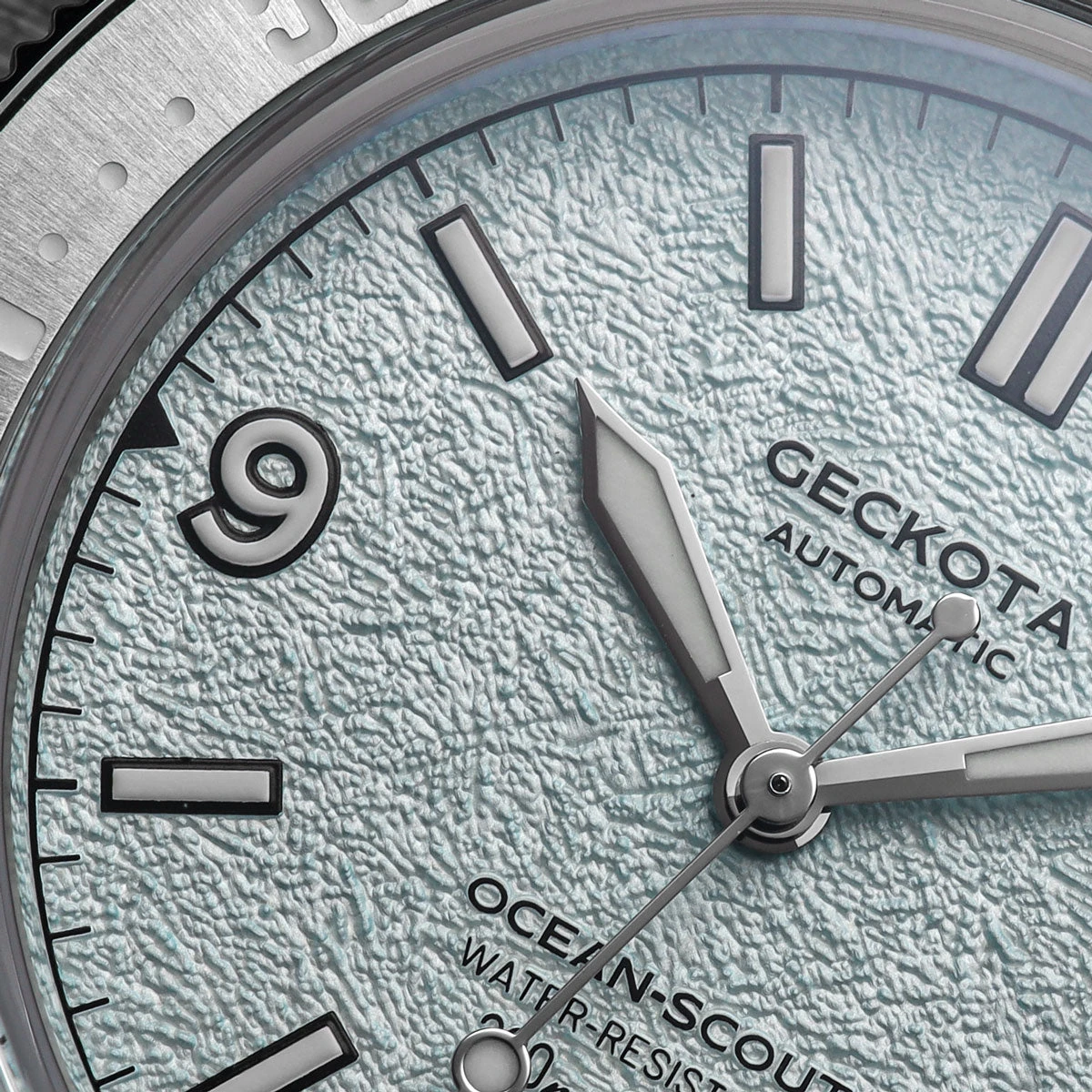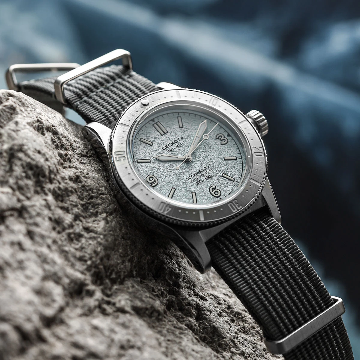 The Geckota Ocean-Scout Frost model debuts our first-ever steel insert bezel for the adventurous Ocean-Scout. The brushed finish of the unidirectional bezel contrasts brilliantly with the polished surfaces of the 316L stainless steel case, still ensuring effortless legibility with a white engraved diver’s scale and luminous pip at 12 o’clock.  With particular attention paid to the Frost, textured dial which contrasts brilliantly against the black-outlined markers, the Geckota Ocean-Scout Frost is a truly eye-catching timepiece. The lack of crown guards enhances the vintage aesthetic and brings to life some of the great dive watches from the 1960’s whilst an anti-reflective sapphire box crystal complements perfectly. The Ocean-Scout lugs are shaped to accommodate both steel and leather straps whilst particular attention has been paid to how a military Nylon strap fits around the watch. A 60-minute diving bezel reinforces the 200m water-resistant capability of the watch.