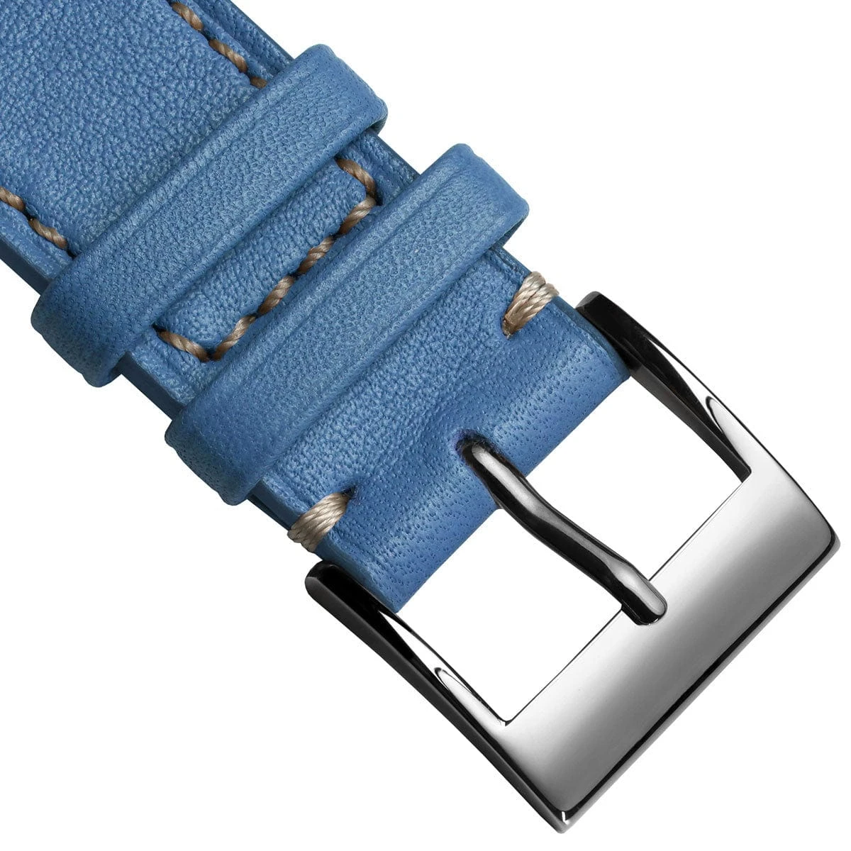 The handstitched edge of the leather watch strap has been expertly executed using contrasting thread and hand-painted with a colour stain to match the leather. This watch strap is available in mltiple lug widths, and features a robust stainless-steel buckle with a high polished finish.