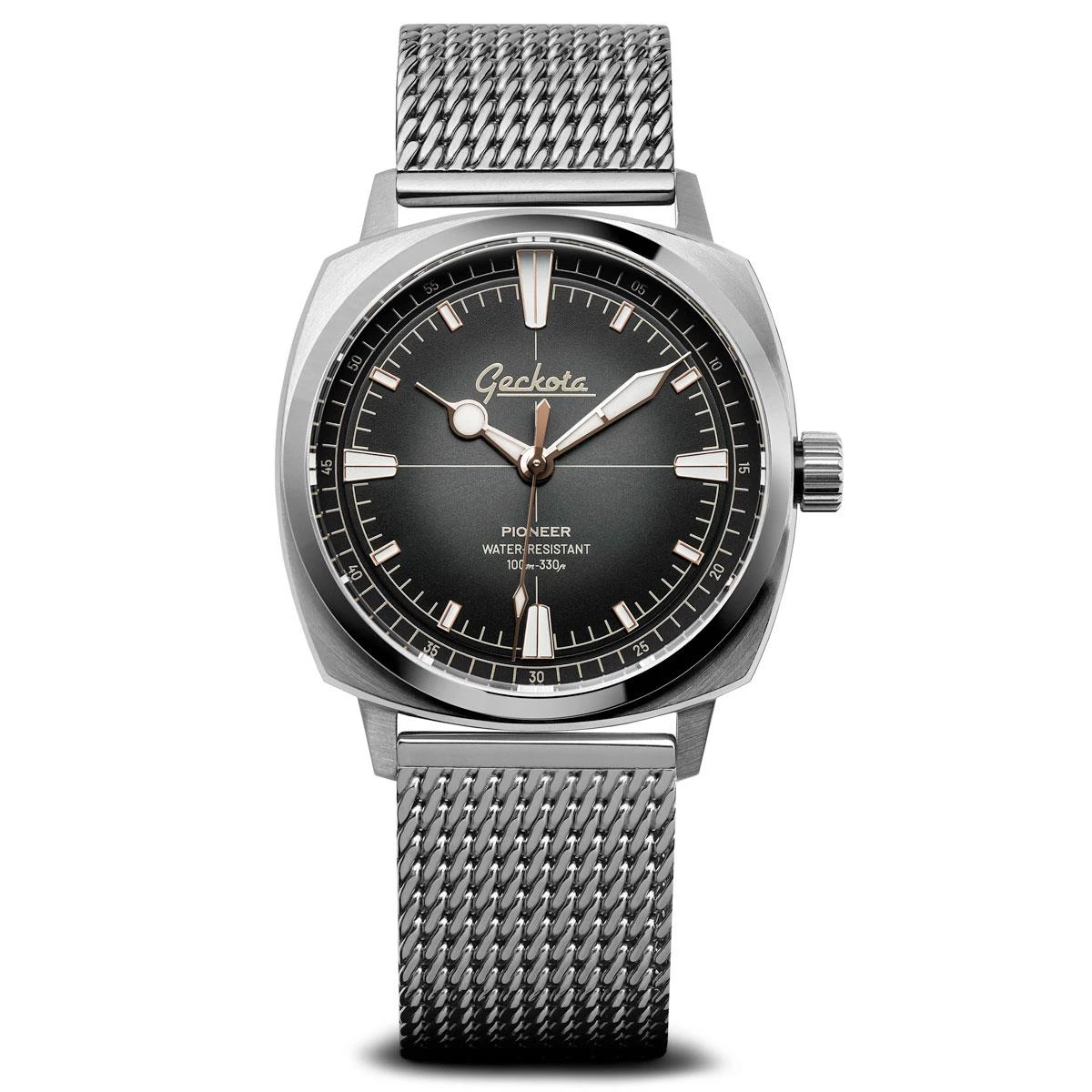 Building on the legacy of the previous model, this new design features a completely new case. The Pioneer is presented in a choice of four dial variations: Grey, Green, Red and Blue, and by popular demand, the watch is fitted with a true time-only mechanical movement.