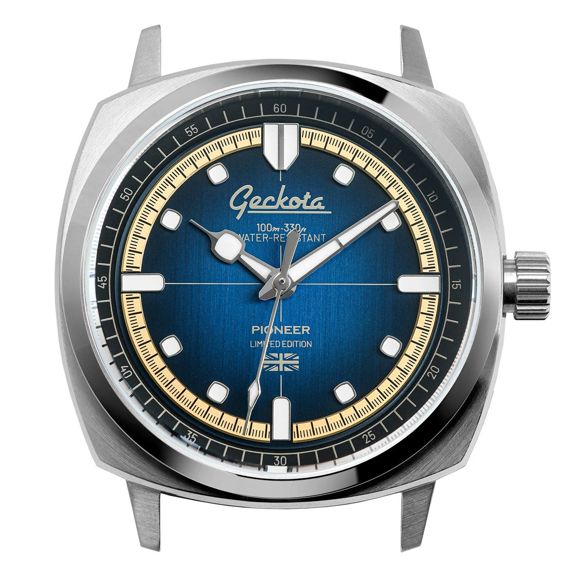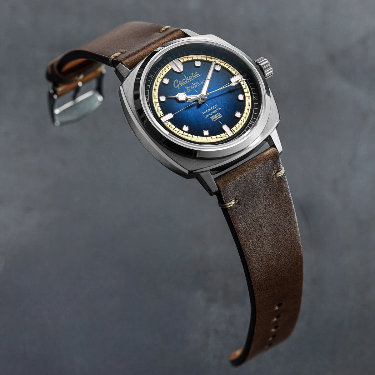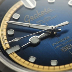 The polished hour and minute hands are also treated with BGW9 for nighttime visibility, while the fume dials bring a pop of colour and contrast. Encased by a bevelled and polished fixed bezel, the Pioneer exudes a refined balance of sportiness and elegance.