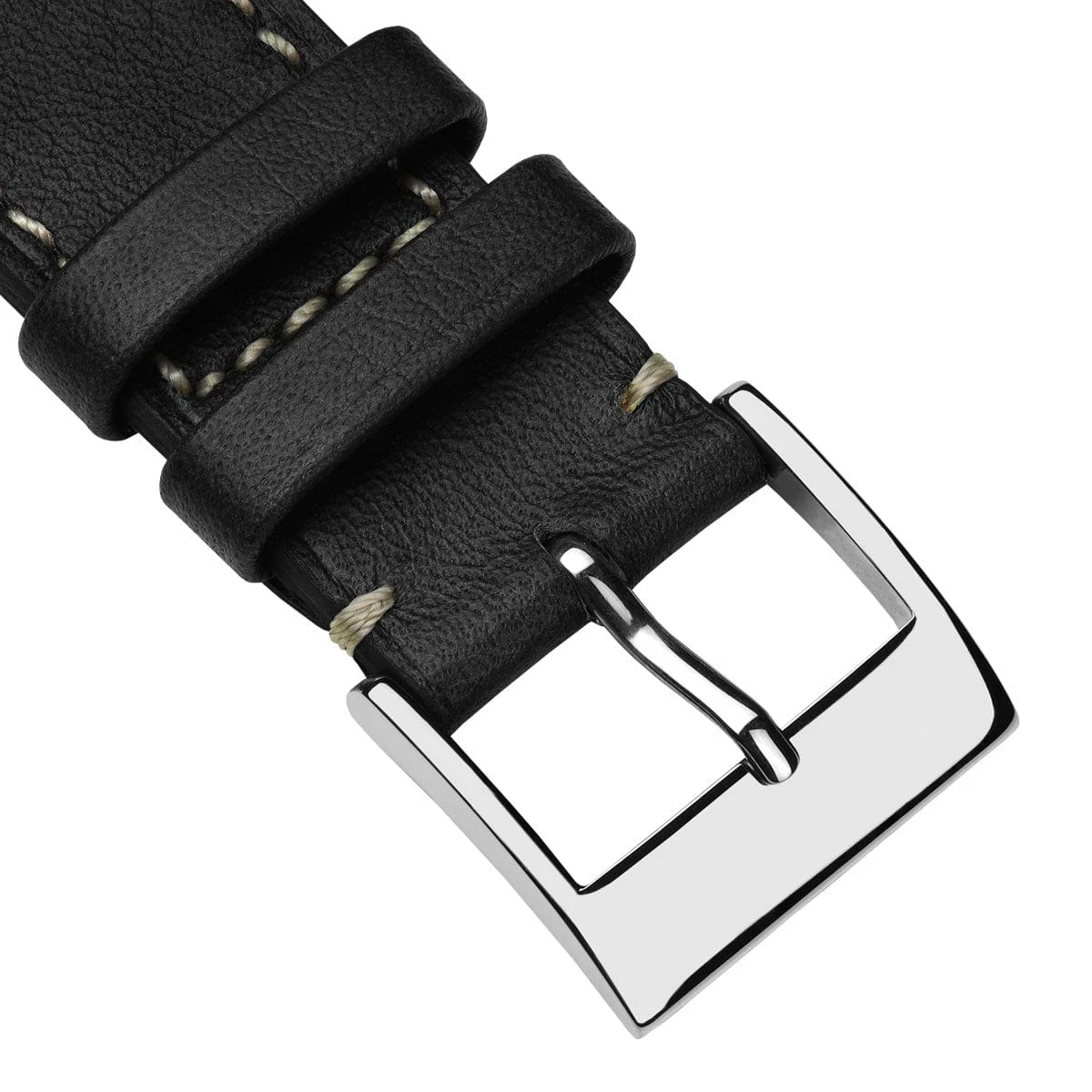 The box-edge stitching of the Rochefort Patina Calf strap has been expertly executed by hand using contrasting ivory-coloured thread and hand-painted with a colour stain to match the leather. This watch strap is available in various lug widths, and features a robust stainless-steel buckle with a highly polished finish.