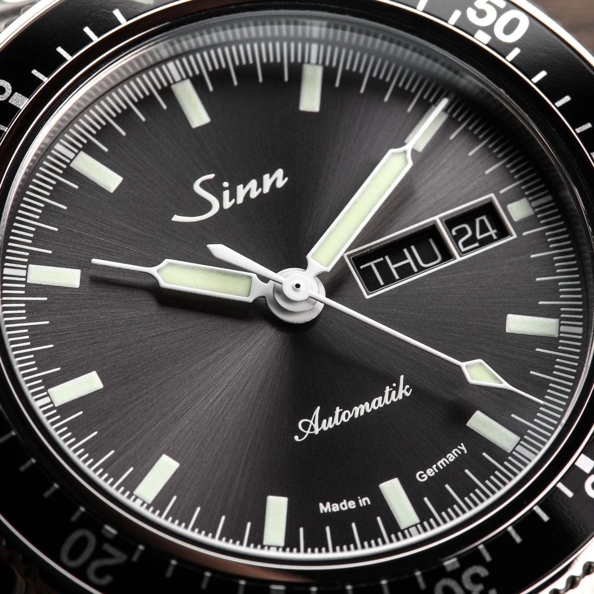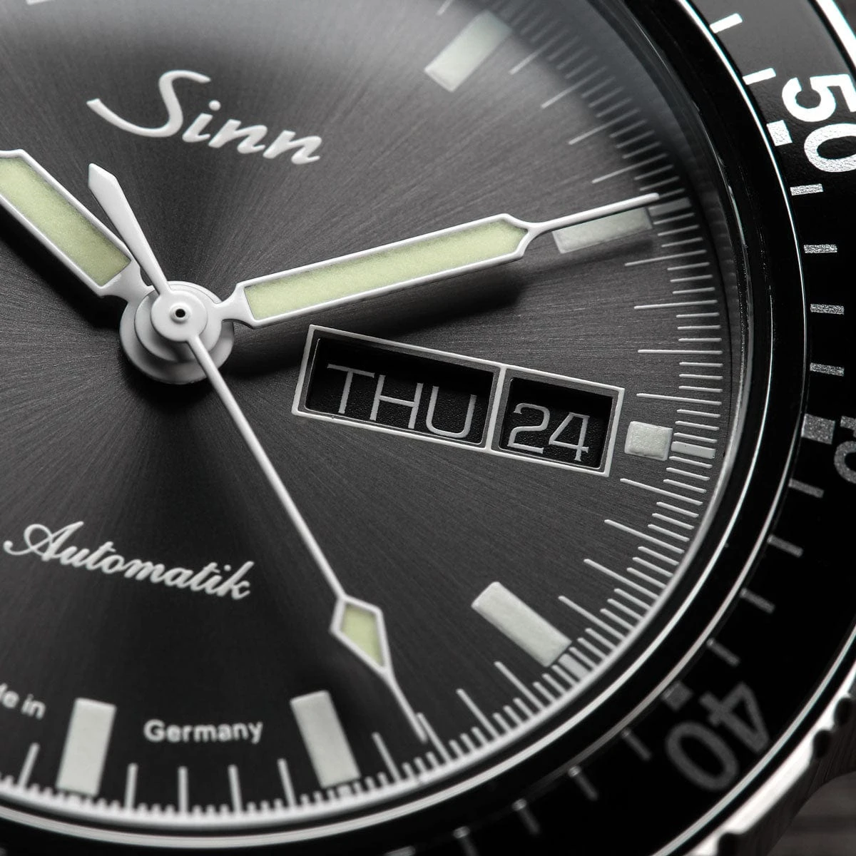 The Sinn 104 is inspired by the classic pilot watch, enhanced by vintage inspired touches that allow for optimum readability. The dial is clearly structured with date/day display, luminous hands and indices and a bidirectional captive pilot’s bezel with minute ratcheting.