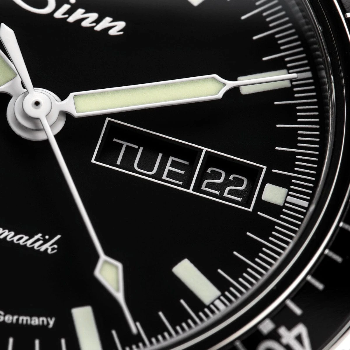 The Sinn 104 is inspired by the classic pilot watch, enhanced by vintage inspired touches that allow for optimum readability. The dial is clearly structured with date/day display, luminous hands and indices and a bidirectional captive pilot’s bezel with minute ratcheting.