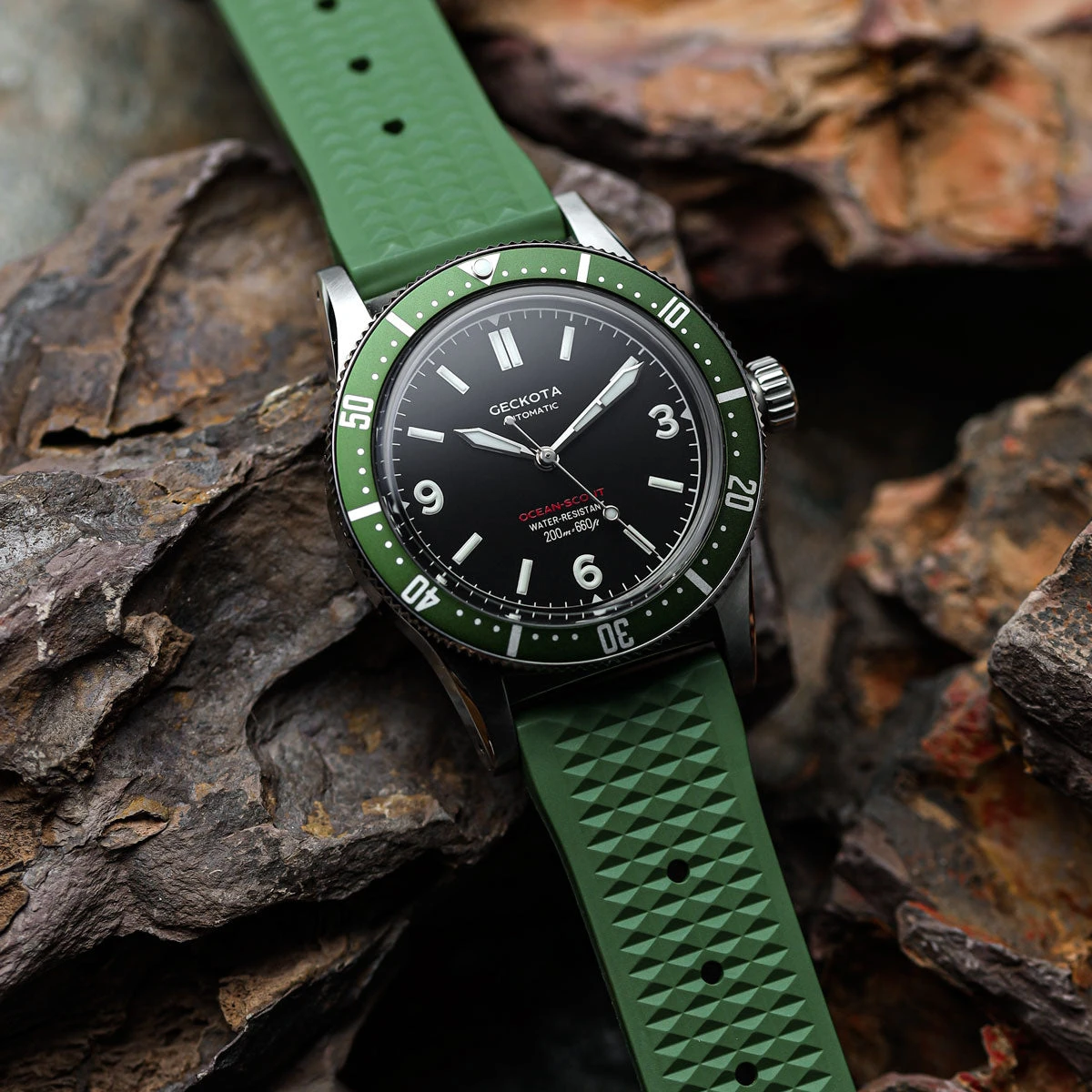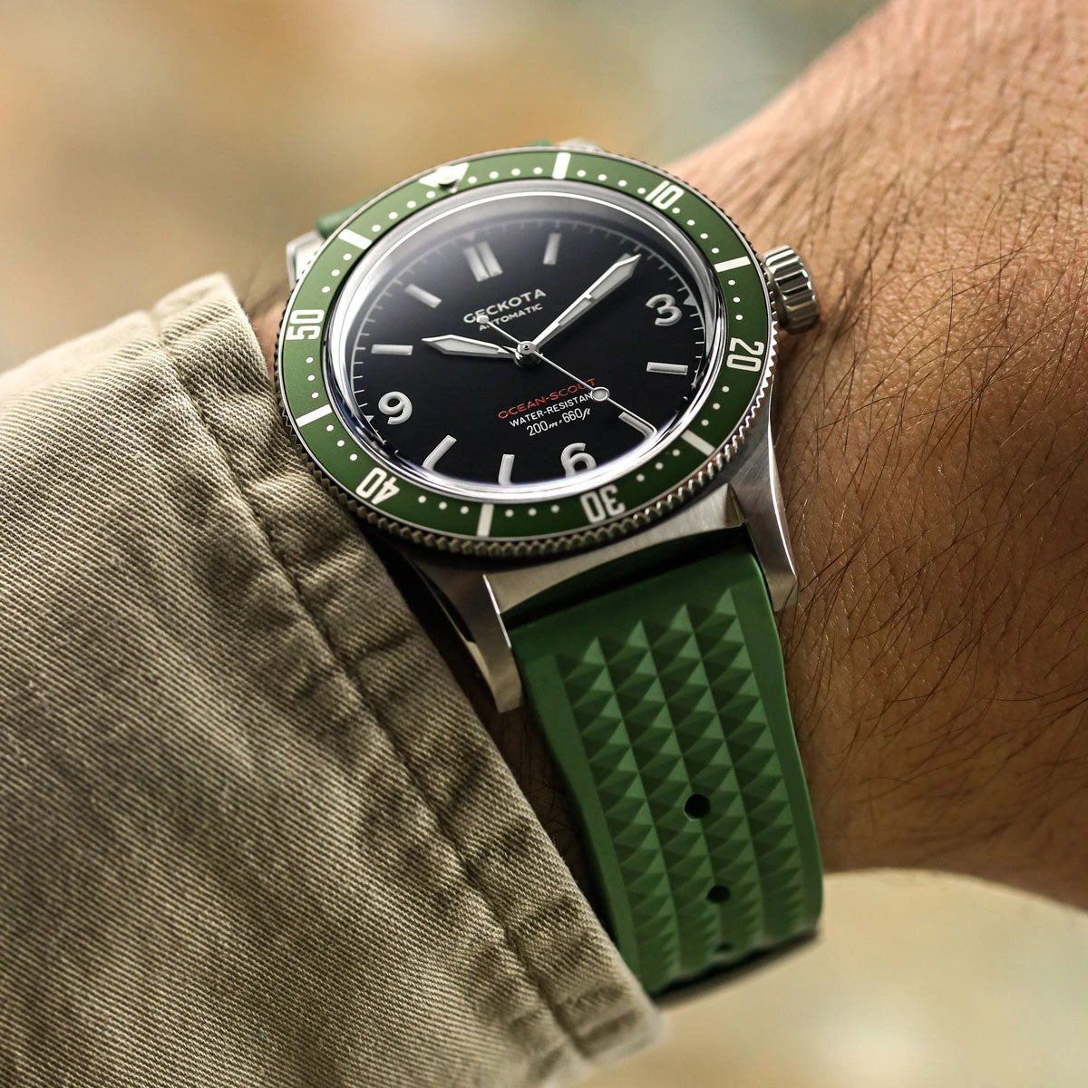 Taking inspiration from 1960s Seiko waffle straps, the Seacroft rubber watch strap is a thoroughly modern design made without compromise. It is technically one of our most advanced diver straps with robust characteristics making it ideal for any watch that lives in challenging climates.