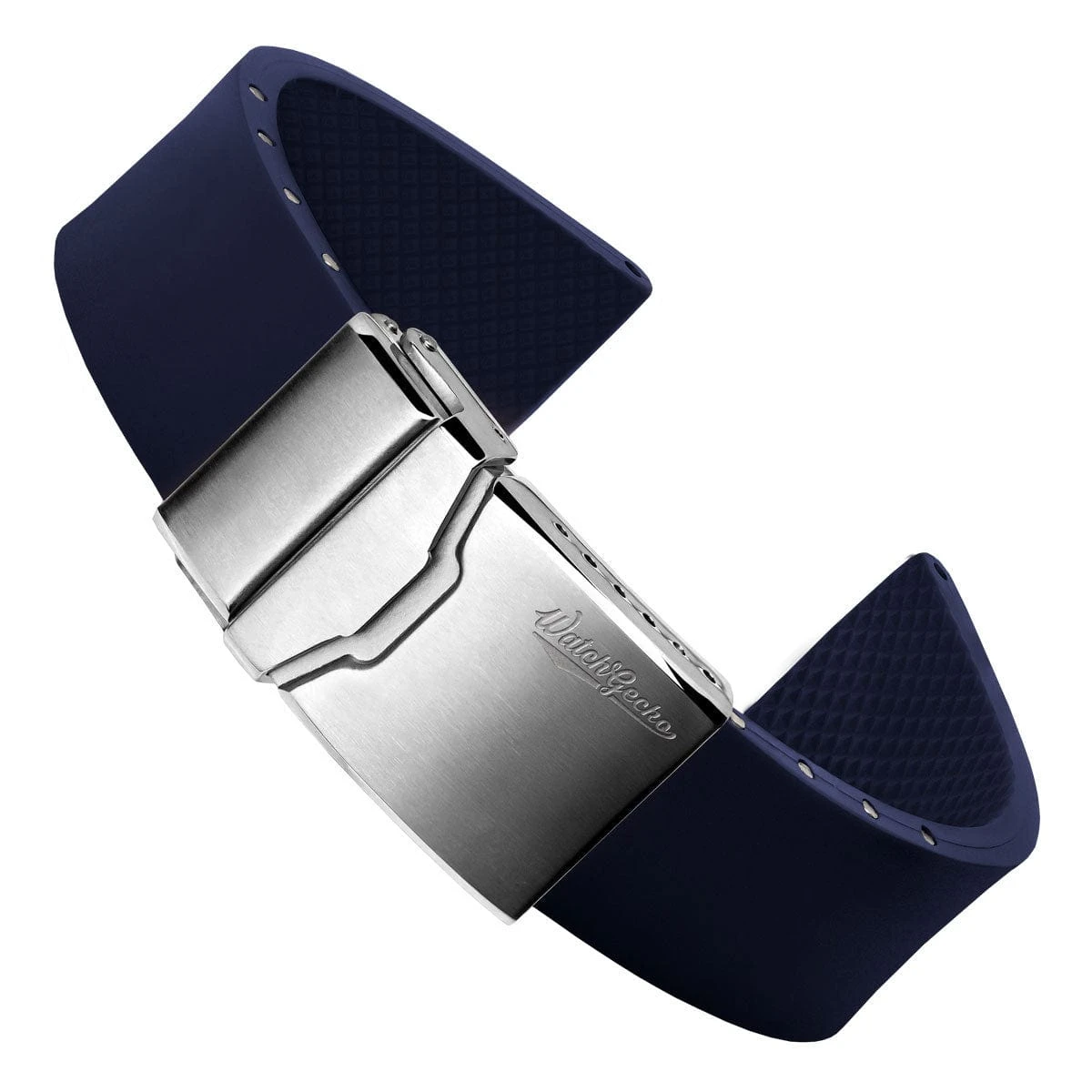 Please note that the rubber will need to be cut in order to size the strap and that the width is tapered meaning that the buckle is 2mm narrower than the lug width. We recommend cutting a section at a time so as not to cut too much off the strap. We do sell spare rubber parts if a mistake is made.