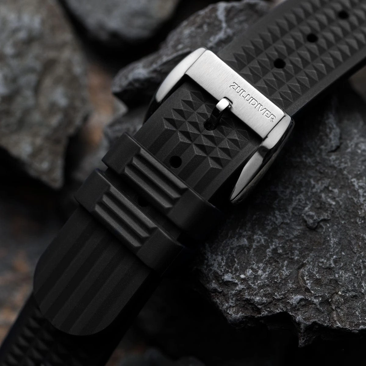 The scientific name of FKM is Fluoro-Elastomer. It is an extremely hard-wearing rubber compound highly resistant to salt water, aggressive chemicals, and extreme temperatures (as low as -45C and high as +300C). It is the perfect choice for a high-end rubber watch strap designed to be fitted to the toughest watches and tackle the harshest environments. Lastly the strap is finished with our brushed steel buckle that is deep etched with our trademark ZULUDIVER logo, so you can take reassurance from the build quality that comes with the name ZULUDIVER.