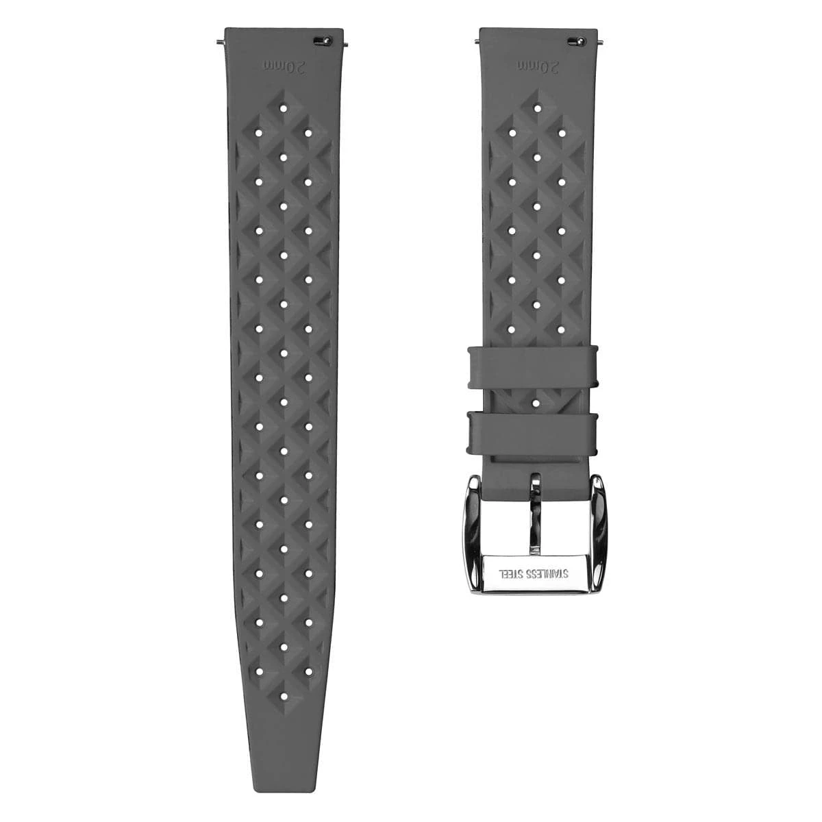 The scientific name of FKM is Fluoro-Elastomer. It is an extremely hard-wearing rubber compound highly resistant to salt water, aggressive chemicals, and extreme temperatures (as low as -45C and high as +300C). It is the perfect choice for a sophisticated rubber strap designed to be fitted to the toughest watches whilst also looking smart.